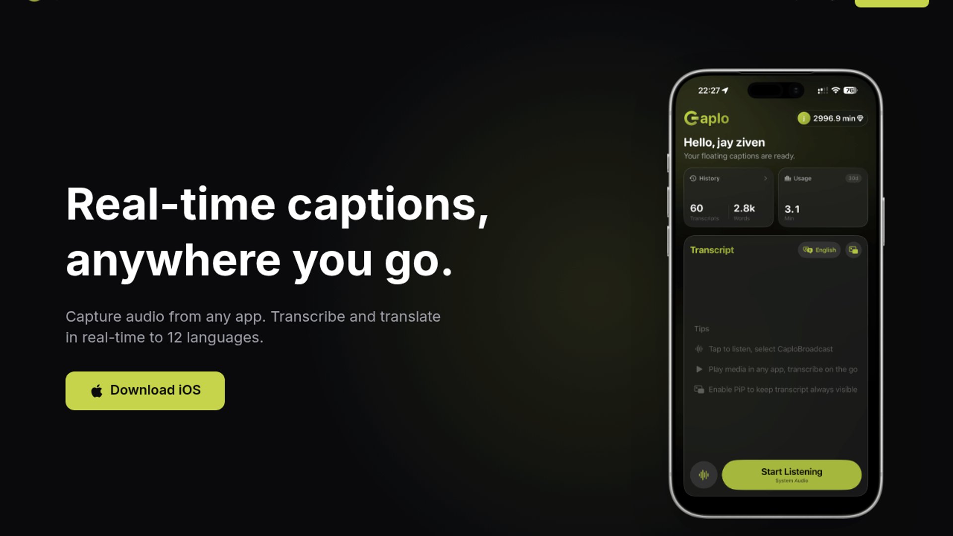 Caplo is a real-time transcription and translation tool for iOS that uses system-wide audio capture to display live subtitles in a floating Picture-in-Picture window. It enables instant captioning for any mobile application—including YouTube, Zoom, and Netflix—supporting over 12 languages to break down communication barriers during meetings, livestreams, and media consumption.