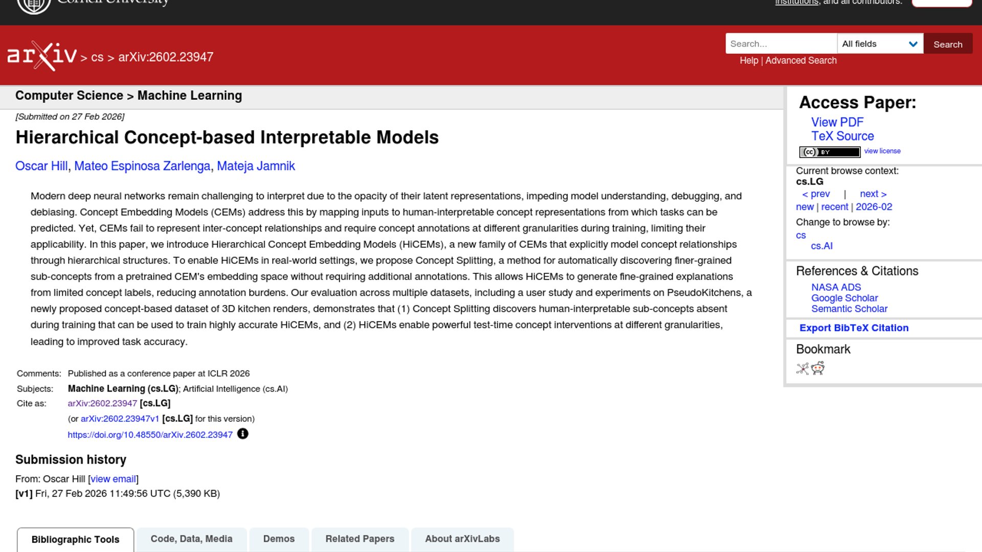 HiCEMs is a new concept-based interpretability paper accepted to ICLR 2026 that adds hierarchical concept embeddings to Concept Embedding Models, letting models represent relationships between concepts instead of treating them as flat labels. Its Concept Splitting method automatically discovers finer-grained sub-concepts from a pretrained CEM, cutting annotation overhead while enabling more precise test-time interventions.