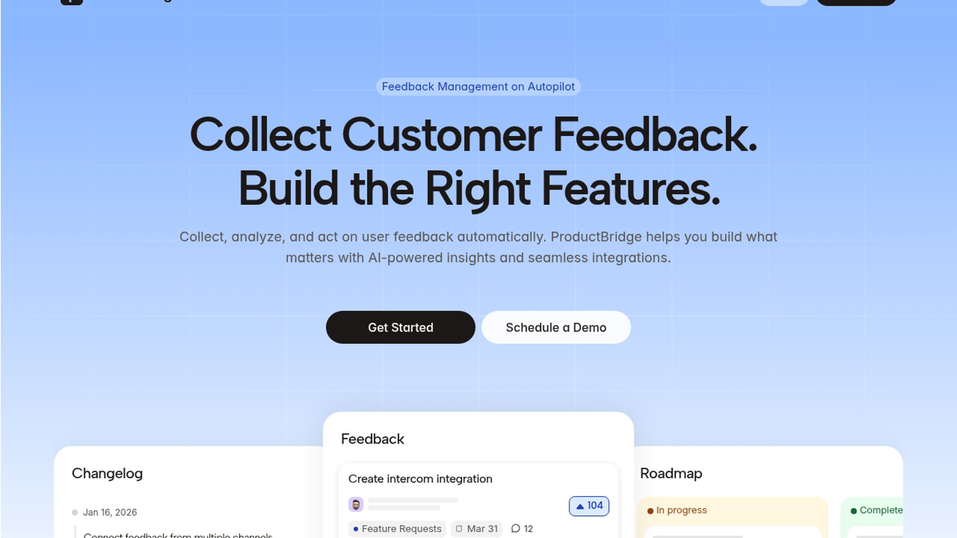 ProductBridge pulls customer feedback from scattered channels like Slack, Intercom, email, widgets, and support threads into one system. Its AI then dedupes, categorizes, prioritizes, and connects requests to a roadmap and changelog so teams can close the loop with users.