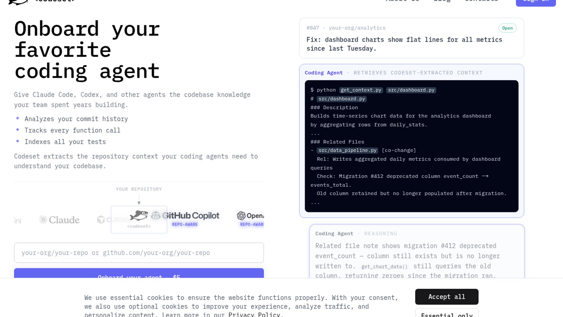 Codeset says repo-local context from git history improved OpenAI Codex performance on two coding benchmarks: codeset-gym-python rose from 60.7% to 66%, and SWE-Bench Pro rose from 56.5% to 58.5%. The system generates static files in the repo with past bugs, pitfalls, co-change links, and test checklists, so the agent consumes them like ordinary code context.