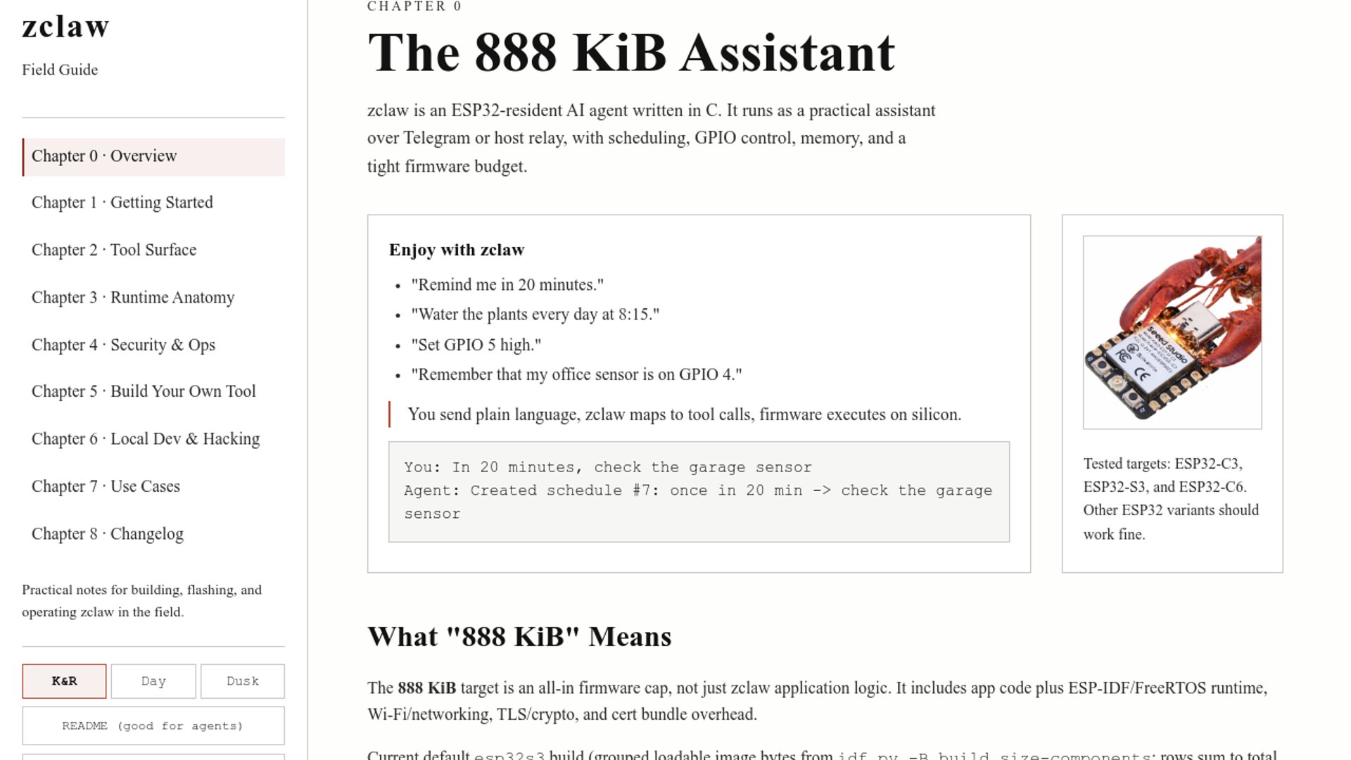 zclaw is an open-source C firmware that runs a Telegram-controlled AI assistant on ESP32 boards while staying under an 888 KiB all-in firmware cap. It combines scheduling, persistent memory, GPIO tool execution, and multiple LLM backends in a footprint small enough for low-cost embedded hardware.
