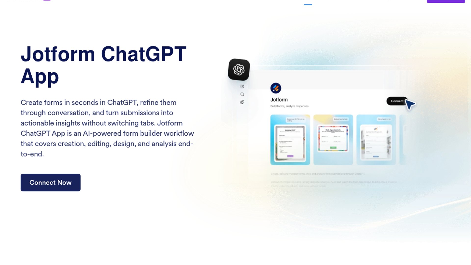 Jotform ChatGPT App lets users create forms, edit fields, filter submissions, and summarize results directly inside ChatGPT. The pitch is straightforward: turn form work into a prompt-driven workflow, with intent detection that can map natural language requests to the right form actions and data lookups.