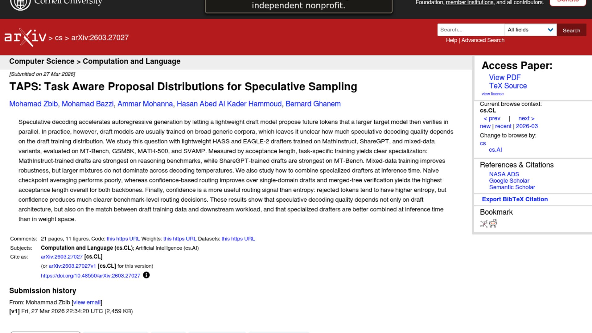 TAPS, short for Task Aware Proposal Distributions for Speculative Sampling, is a research paper about improving speculative decoding by matching draft-model training data to the downstream task. The paper shows that specialized drafter models can outperform generic ones, and that inference-time composition methods like confidence-based routing and merged-tree verification can increase acceptance length more effectively than simple checkpoint averaging. It is positioned as a practical optimization for accelerating autoregressive generation while preserving output quality.