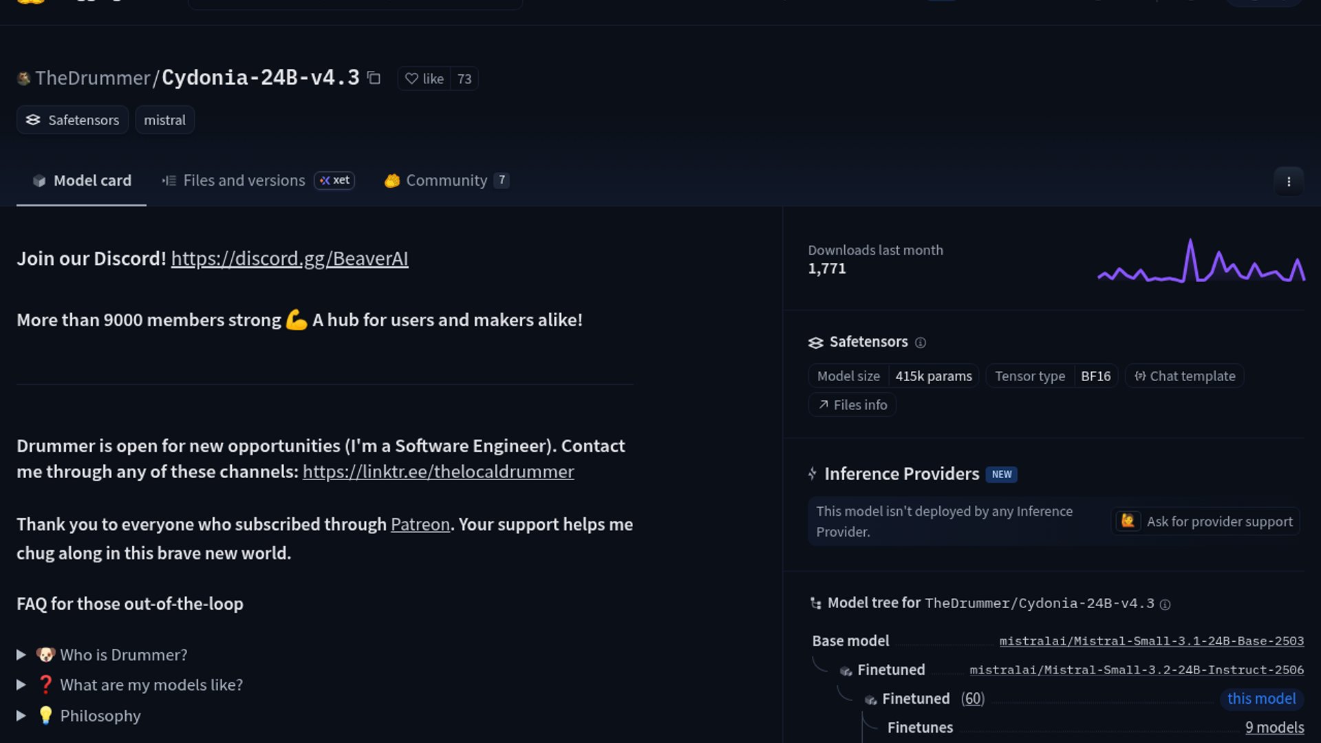 - –Cydonia-24B-v4.3 Q4_K_M sits around 14.3GB as a GGUF, so it fits but leaves very little headroom once KV cache and runtime overhead enter the picture.