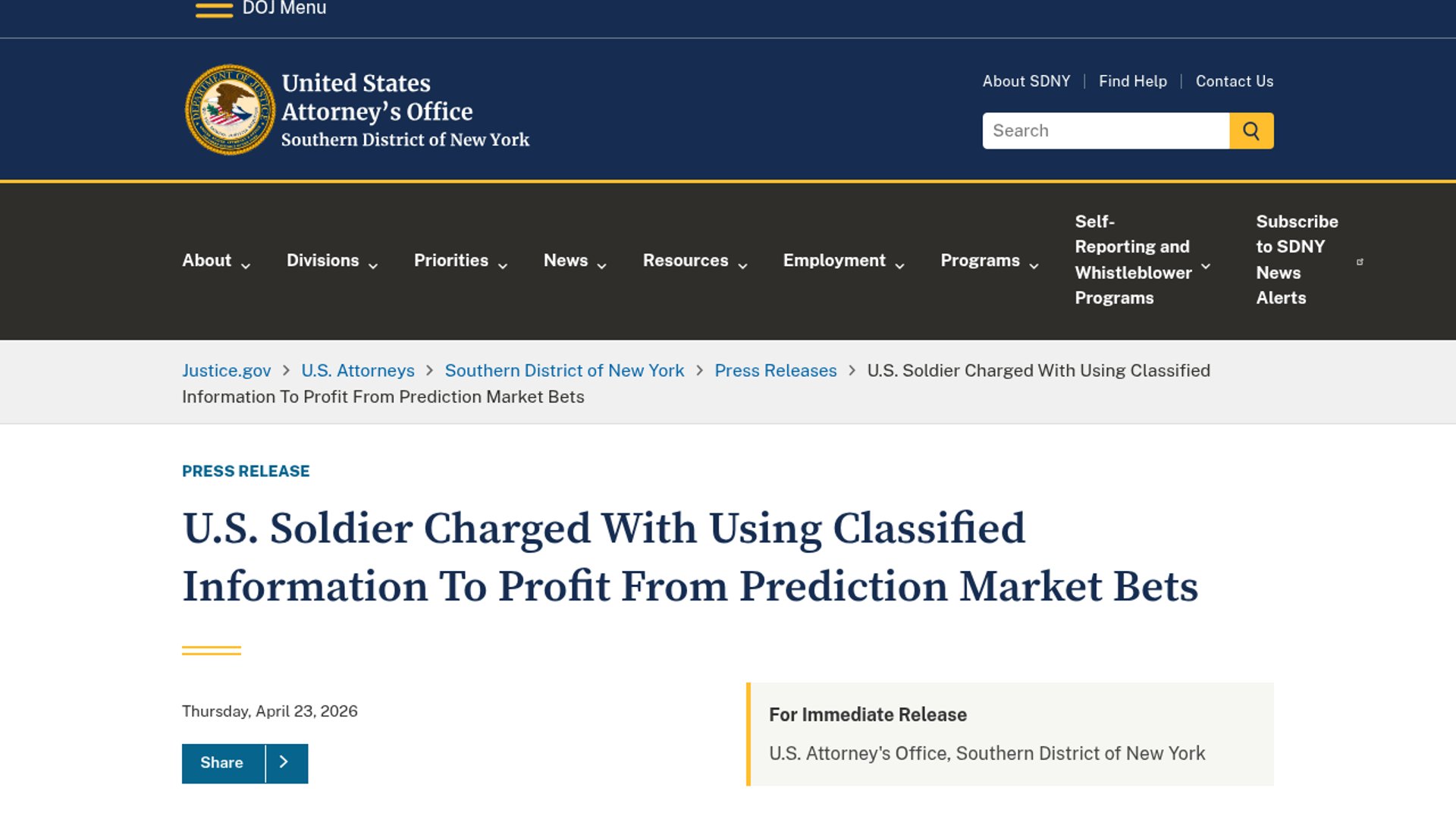 The DOJ says a U.S. Army soldier was indicted for allegedly using classified information tied to a military operation involving Venezuela to place bets on Polymarket, a prediction market. According to the press release, he allegedly profited by timing trades on markets about Maduro, U.S. forces in Venezuela, and related outcomes, turning nonpublic national-security information into trading gains.