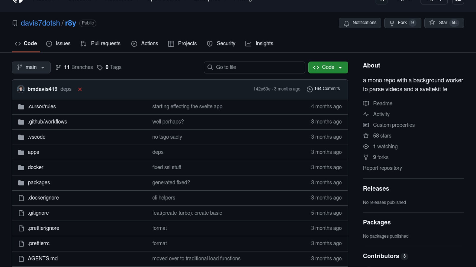Ben Davis's R8y project uses SvelteKit and Bun in a monorepo to automate video parsing and management for creators. It showcases a modern TypeScript stack designed for high-performance developer workflows.