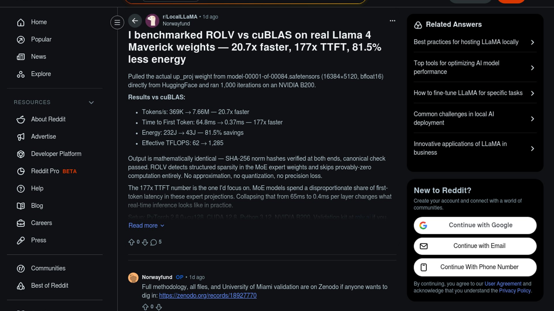 rolv says its rolvsparse library beat cuBLAS on a real Llama 4 Maverick MoE expert weight pulled from Hugging Face, pushing throughput from 369K to 7.66M tokens/s on an NVIDIA B200 while cutting time to first token from 64.8ms to 0.37ms. The company’s pitch is that it can skip provably zero compute in sparse expert projections without changing outputs, turning MoE latency and energy efficiency into an infrastructure advantage rather than a model-quality tradeoff.