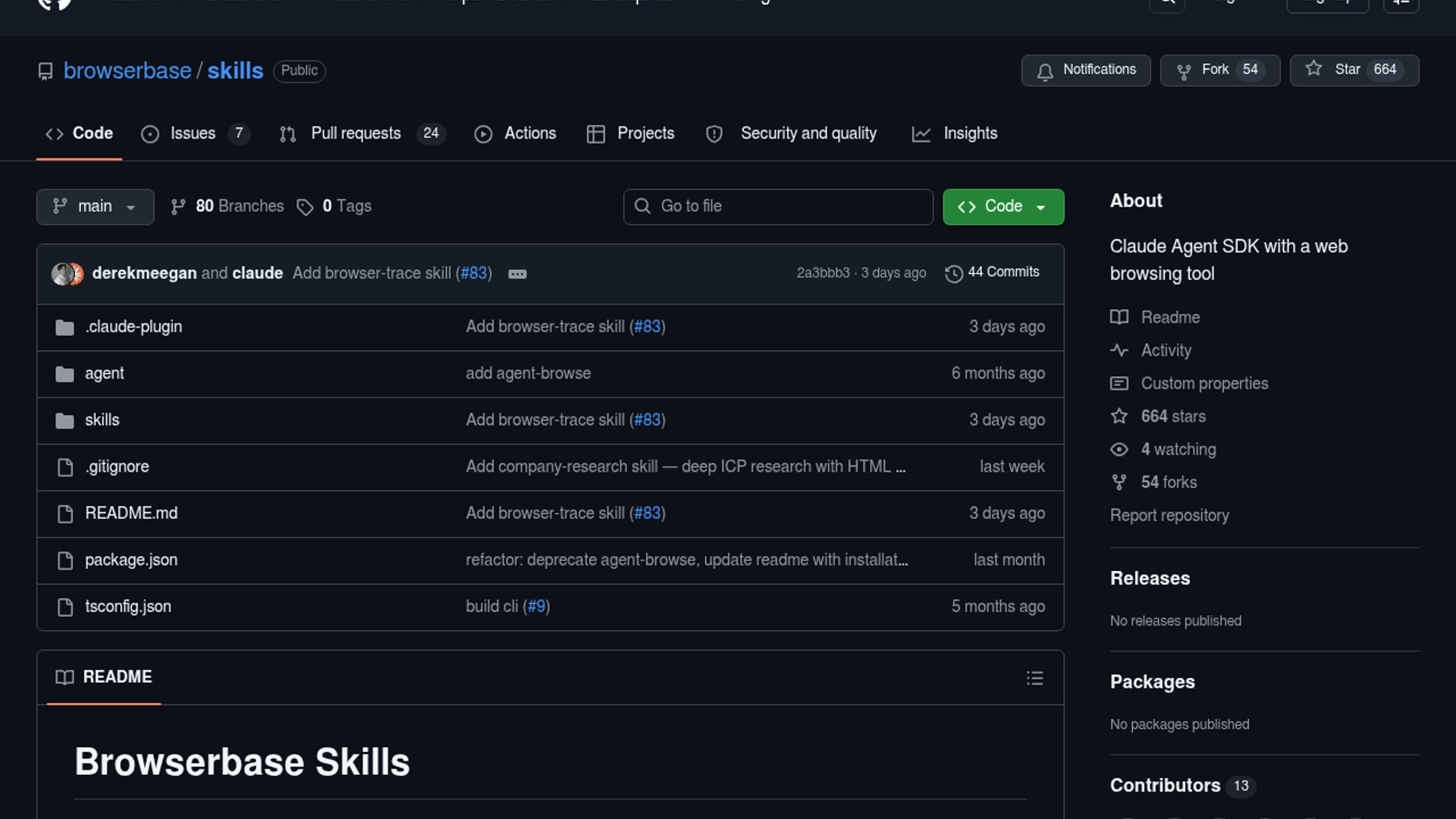 Browserbase Skills is an open-source plugin for Claude Code that adds browser automation and Browserbase CLI workflows on top of the bb tool. The repo bundles skills for remote browsing, session and project management, serverless browser functions, cookie syncing, web search, static fetching, usage dashboards, site debugging, and adversarial UI testing.