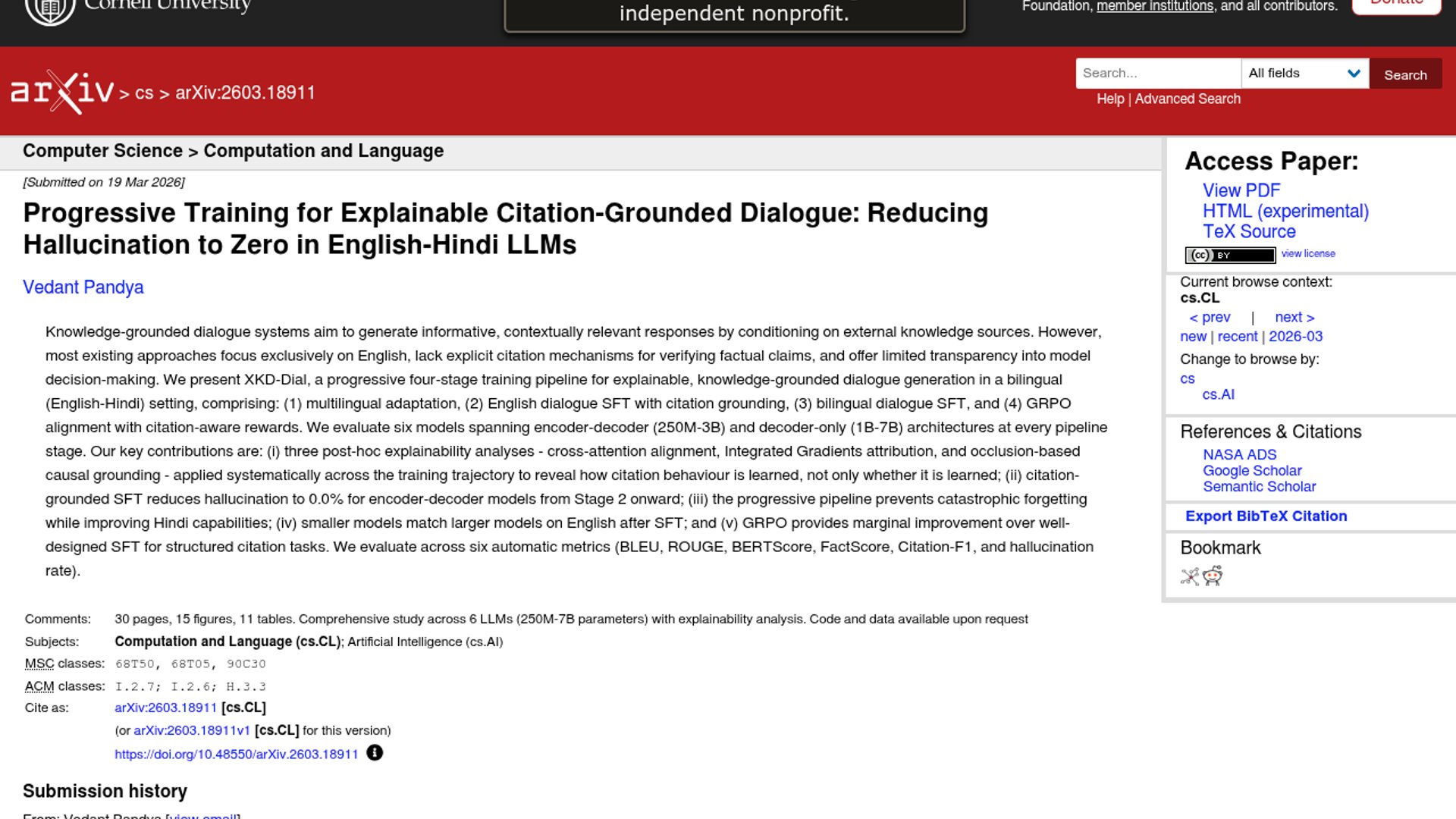 XKD-Dial is a progressive four-stage training pipeline for bilingual English-Hindi dialogue that teaches models to ground answers in citations rather than free-form guesses. In the paper’s experiments, citation-grounded SFT drives hallucination to 0.0% for encoder-decoder models while preserving Hindi capability.