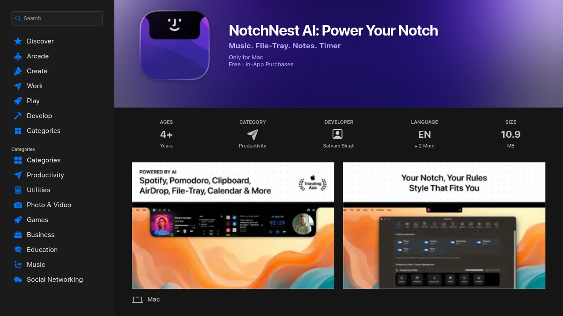 NotchNest AI is a Mac app that transforms the notch into a compact command center powered by Apple Intelligence. It bundles AI clipboard management, AI briefings for calendar events, quick notes, bookmarks, music control, file tray access, Pomodoro timing, AirDrop shortcuts, camera mirroring, and a small game break. The pitch is privacy-first utility: local processing, no cloud dependency, and a lightweight workflow layer for Mac users who want core actions one click away.