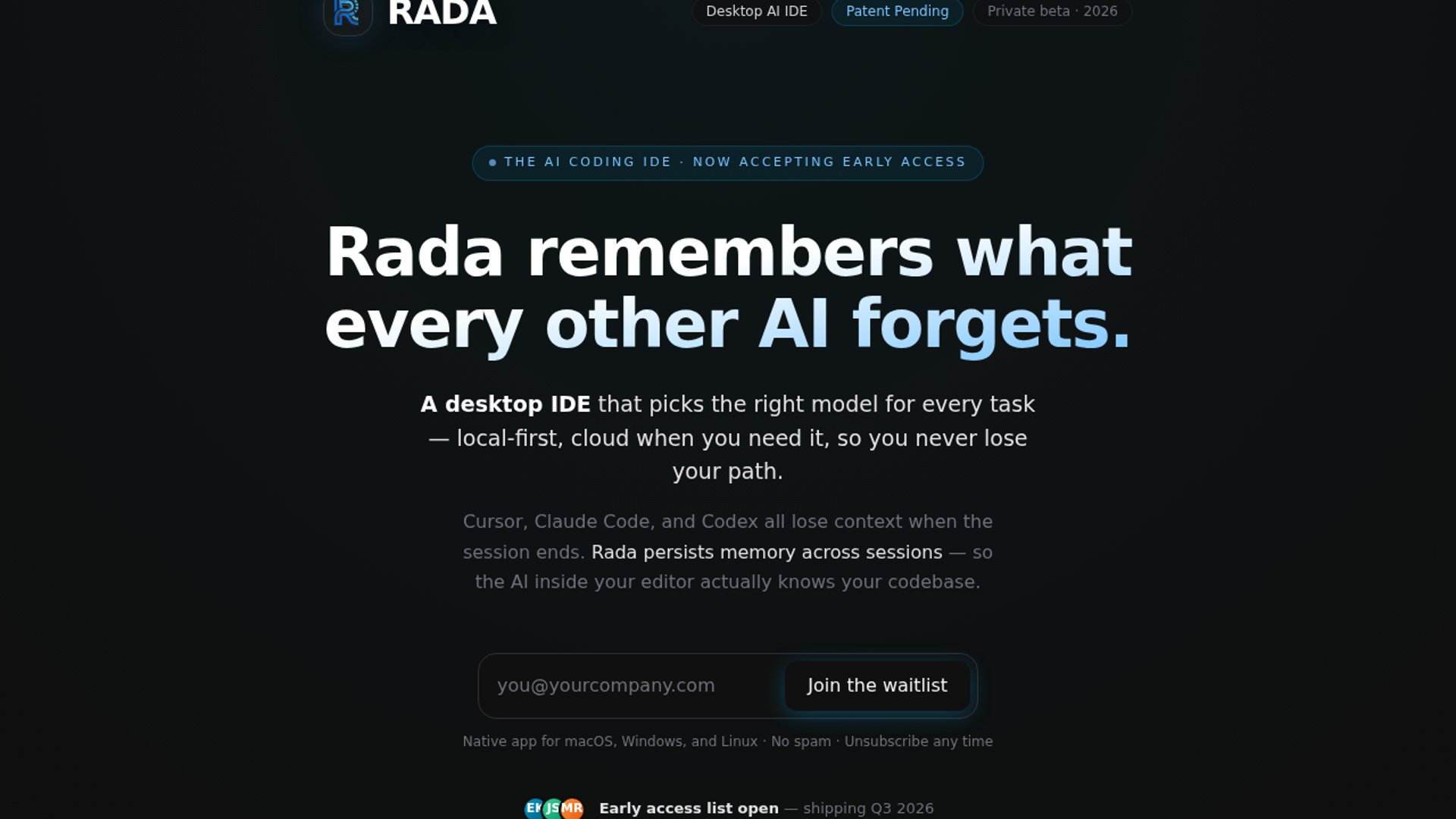 Rada is a closed-beta AI coding workspace that keeps one GGUF model resident in memory and changes system prompt, temperature, and context window by intent instead of hot-swapping models. It defaults to local models, then falls back to cloud endpoints only when a task exceeds what the current machine can handle.