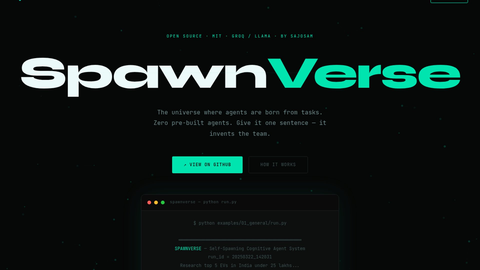 SpawnVerse is an open-source Python agent system that turns a task into a custom team of generated agents, runs them in parallel, and records shared memory plus a fossil record across runs. The author is asking for contributors to help with sandboxing, reliability, evaluation, and performance.