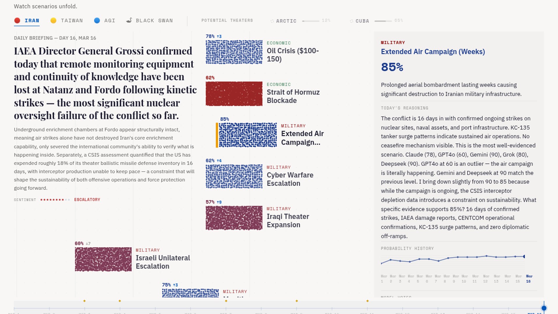 DOOMCLOCK is an autonomous crisis-monitoring app where Claude, GPT-4o, Gemini, Grok, and DeepSeek independently score scenario probabilities and an orchestrator reconciles the outputs twice daily. The public build tracks active theaters like Iran, Taiwan, and AGI, while the devblog documents hard-won prompt engineering lessons from live operation.