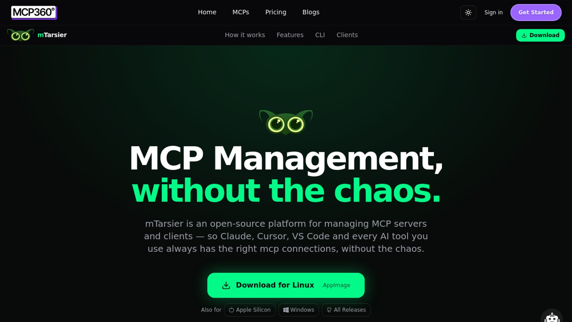 mTarsier is a free, open-source desktop app from MCP360 that centralizes MCP server configuration across tools like Claude Desktop, Cursor, Windsurf, and VS Code. It runs locally on macOS, Windows, and Linux, adds marketplace installs and auto-backups, and debuted on Product Hunt at #3 with 105 upvotes.