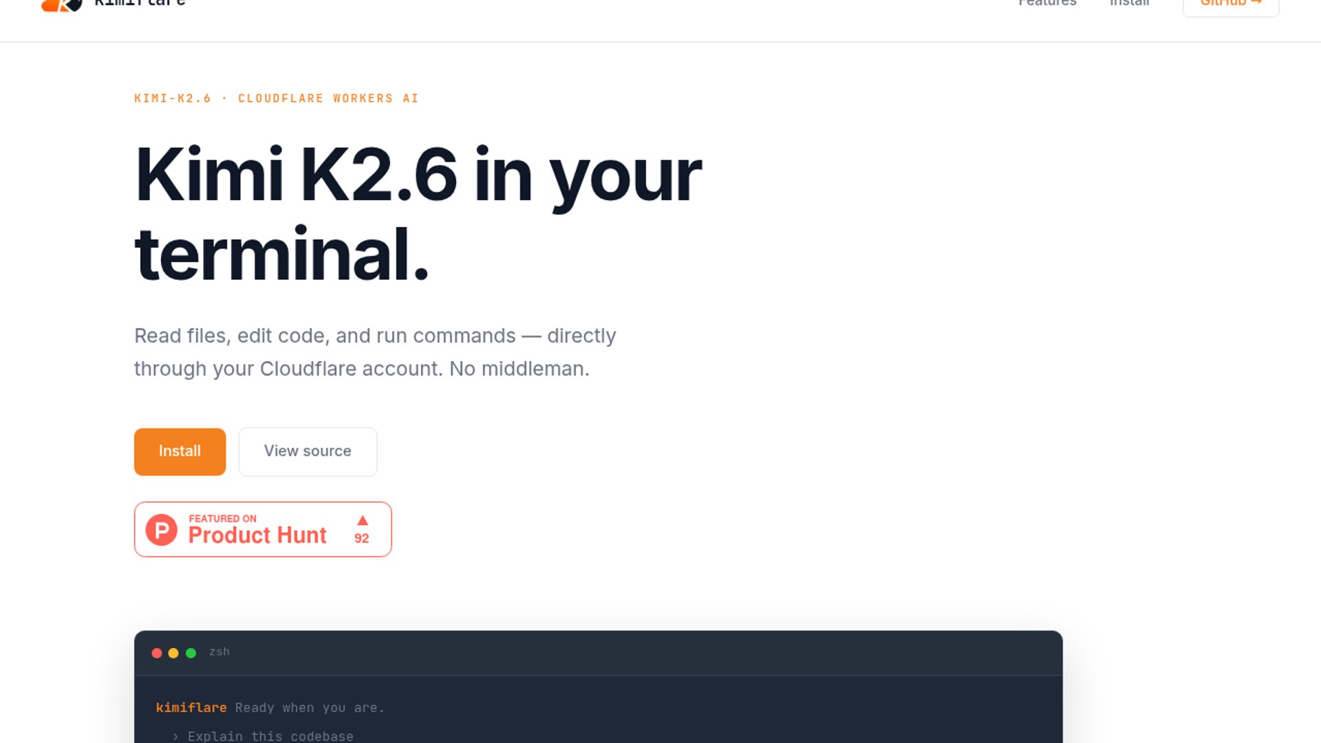 kimiflare is an open-source, terminal-native coding agent that runs Kimi K2.6 through Cloudflare Workers AI. It aims to recreate the Claude Code style workflow with direct Cloudflare billing, multi-turn tool use, and a local CLI experience.