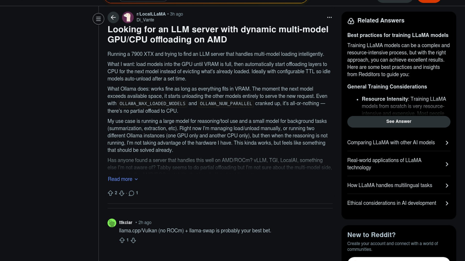 A Reddit thread in r/LocalLLaMA is asking for an LLM server on AMD/ROCm that can keep multiple models resident by filling GPU VRAM first, then spilling overflow layers to CPU instead of fully evicting loaded models. The author says Ollama handles multi-model loading only while everything fits in VRAM, which makes mixed workloads like pairing a large reasoning model with a smaller background model awkward to manage.
