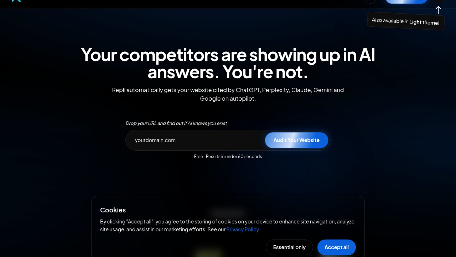 Repli automates SEO and generative-engine optimization for lean teams, publishing clustered content, fixing site issues, and tracking when AI systems cite your brand. It is pitched as an autopilot path to Google rankings and AI-answer visibility without a dedicated SEO team.