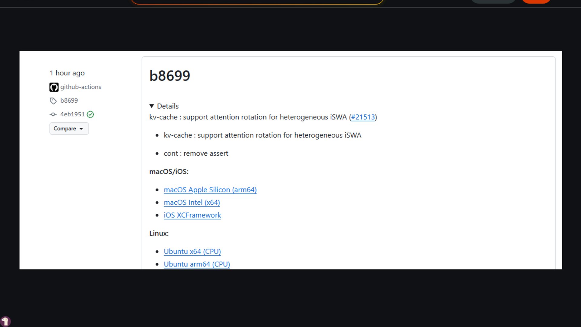 - –The release notes point to `kv-cache : support attention rotation for heterogeneous iSWA`, which is the concrete signal that SWA-style workloads are now part of the supported path.