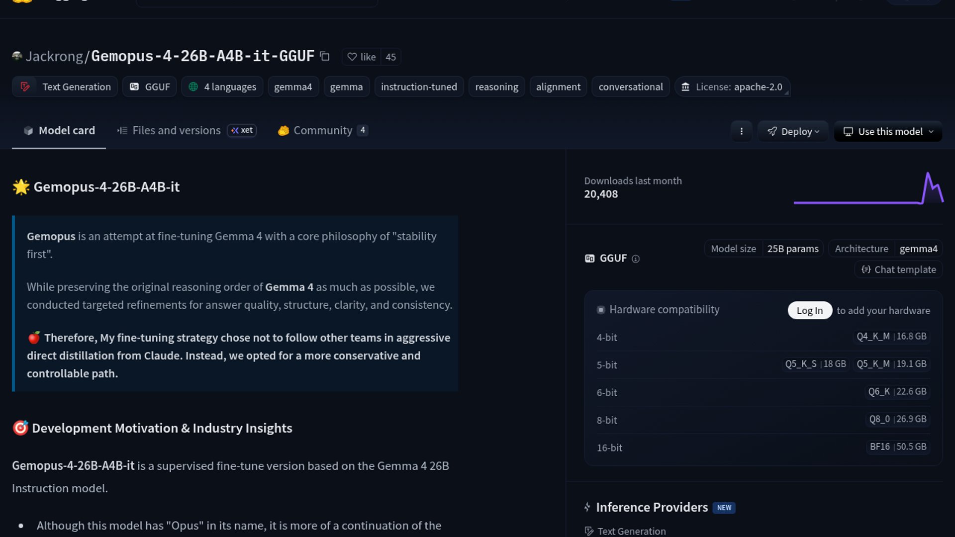 A new open-source fine-tune of Gemma, dubbed Gemopus 4 26B, has been released to the community. Early claims suggest the 26-billion parameter model approaches the reasoning capabilities of Anthropic's flagship Opus 4.6.