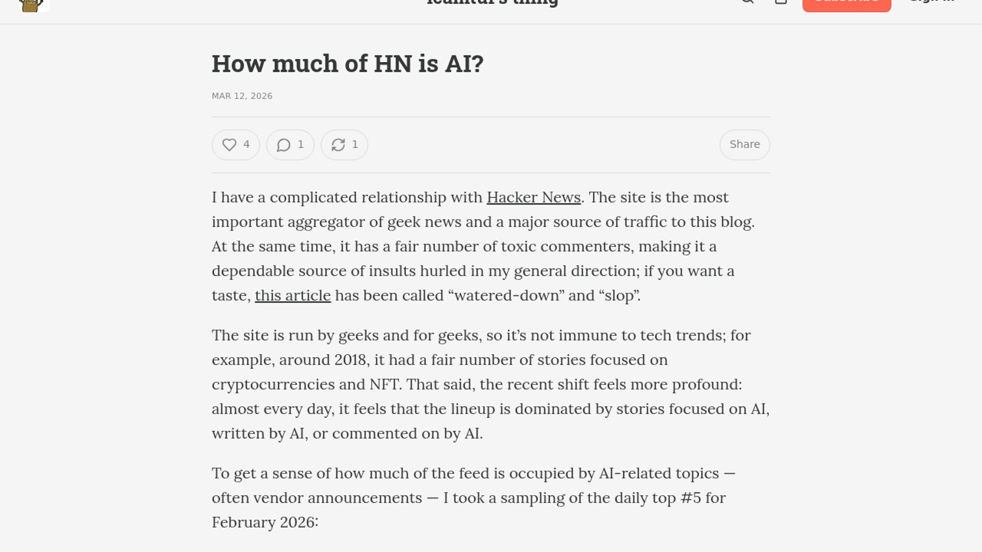 In a March 2026 Substack post, lcamtuf samples Hacker News’ daily top-five stories for February and finds AI topics occupying most of the front page on nearly every day. He then uses Pangram plus manual review to argue that some of the linked posts themselves were likely LLM-written, turning HN’s AI boom into both a topic problem and a content-quality problem.