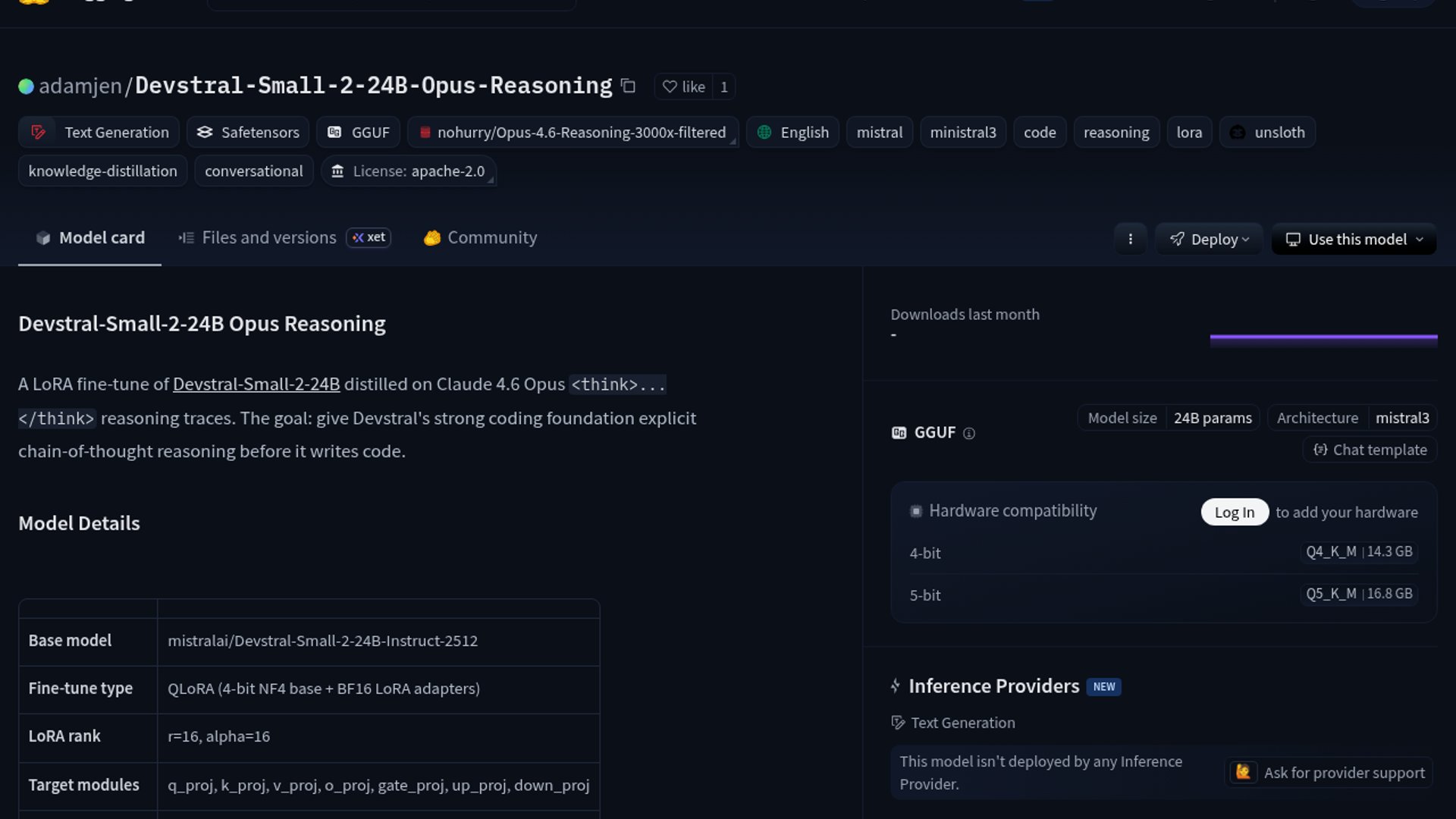 Adam Jenner fine-tuned Devstral-Small-2-24B on roughly 2.3k Claude 4.6 Opus reasoning traces, then shipped Q4_K_M and Q5_K_M GGUFs plus a LoRA adapter. The goal is to make the local coding model reason explicitly before it writes code, with Q5 recommended for best quality.