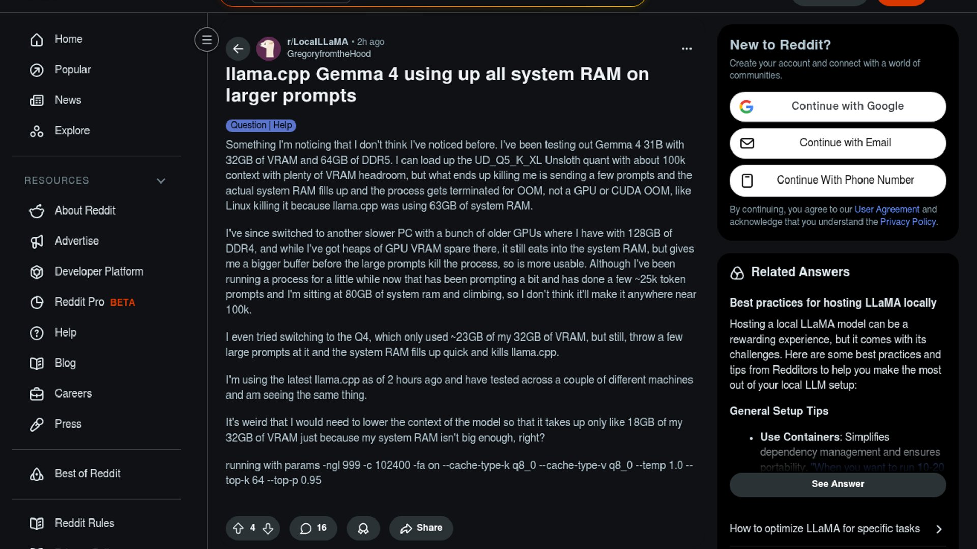 Users running Gemma 4 31B in llama.cpp report that long conversations can push system RAM into OOM even when VRAM still has headroom. The thread suggests the bottleneck is KV-cache and prompt-processing memory growth, not a straightforward model-weight load issue.