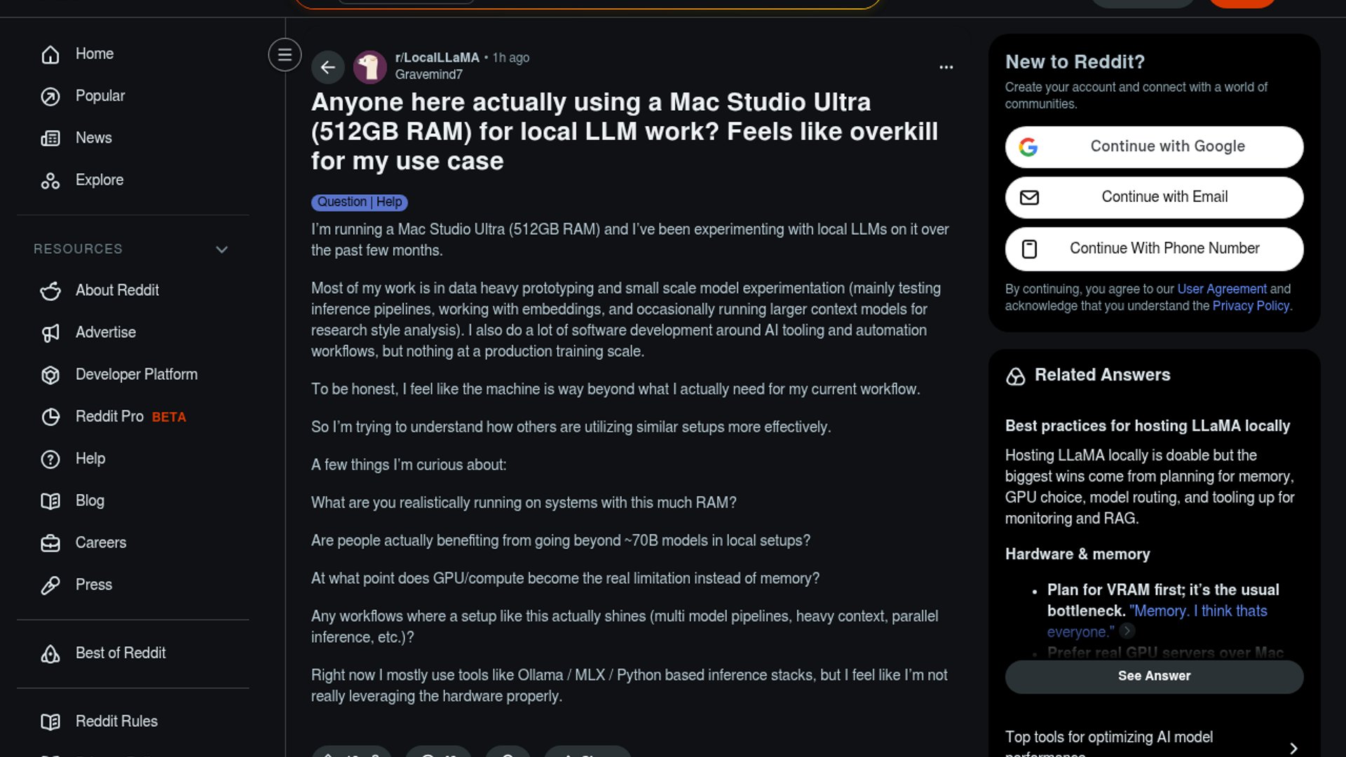 A Reddit discussion highlights the Mac Studio Ultra (512GB RAM) as a niche "frontier workstation" specifically suited for running massive 400B+ parameter models locally. While considered overkill for 70B models, it remains one of the few consumer-accessible devices capable of running models like DeepSeek-R1 (671B) or Llama 3.1 405B entirely in unified memory without complex server setups.