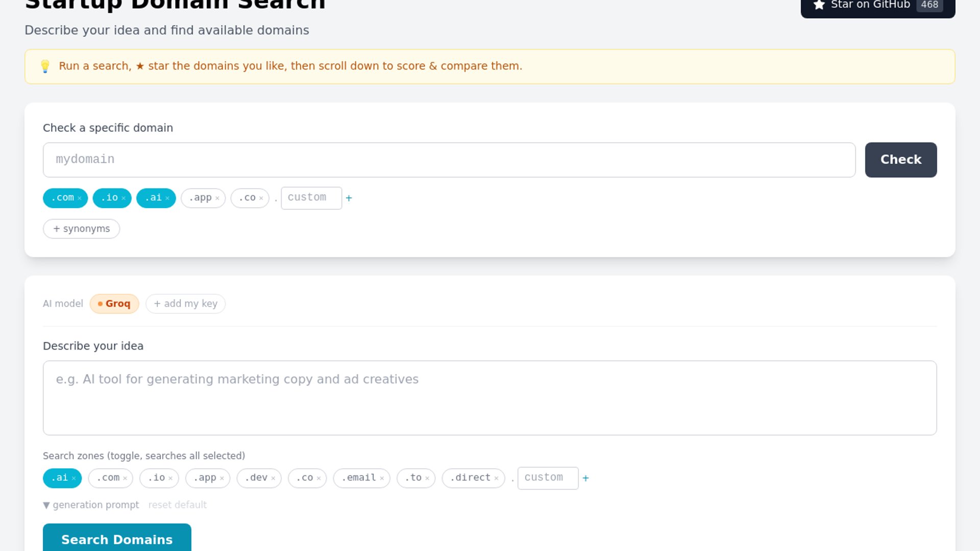 Startup Domain Search is a browser-based domain finder that generates 60 candidates, checks real-time availability across chosen TLDs, and scores each option for length, pronounceability, memorability, brandability, zone availability, and AI fit. It runs as a static GitHub Pages app with no signup or backend.