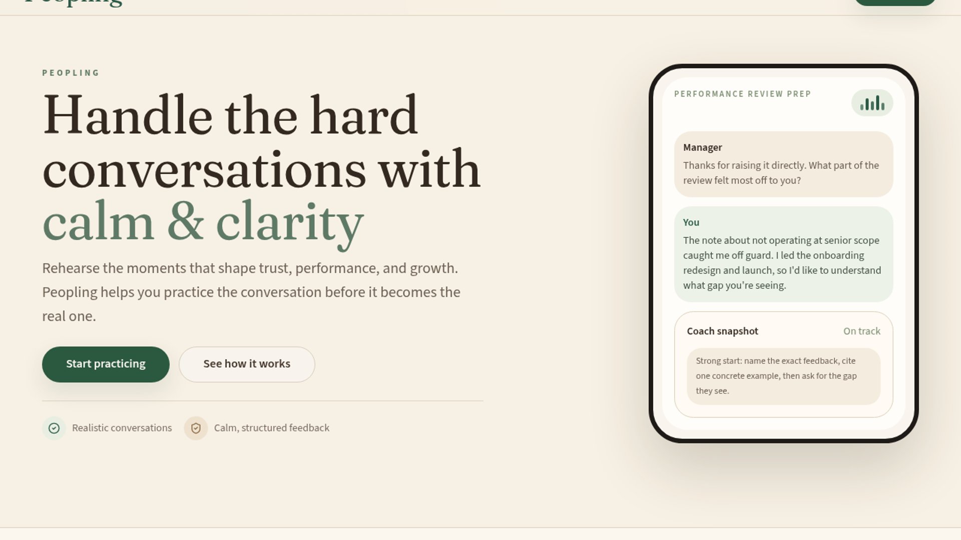 Peopling is a private AI voice roleplay app for rehearsing hard conversations before they happen. It targets manager pain points like feedback, alignment, and strained 1:1s.