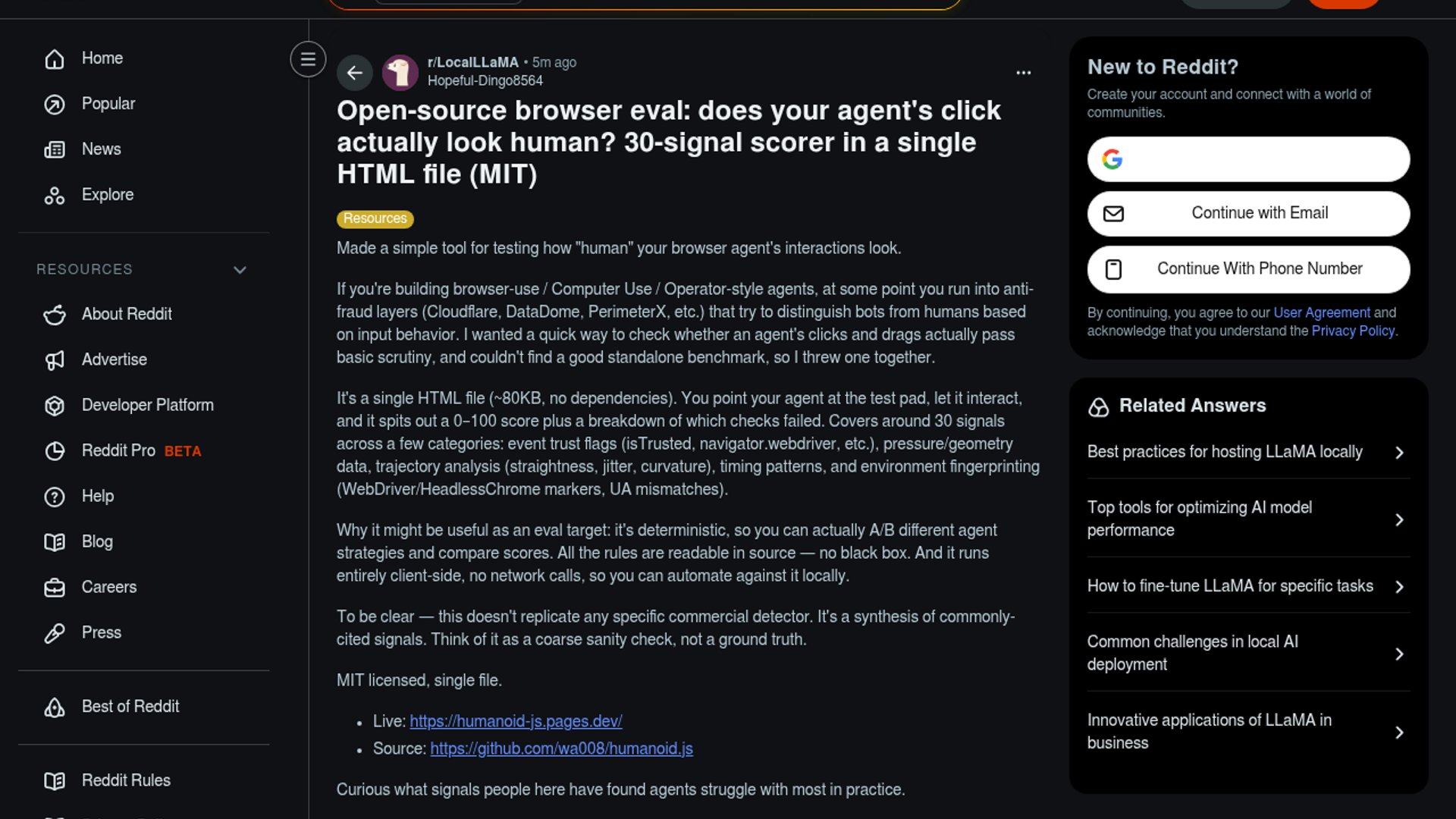 humanoid.js is an MIT-licensed, single-file browser tool for scoring how human-looking clicks, long presses, and swipes appear across roughly 30 interaction and environment signals. It targets AI browser-agent builders who need a deterministic local eval for pointer behavior, not a commercial anti-fraud clone.