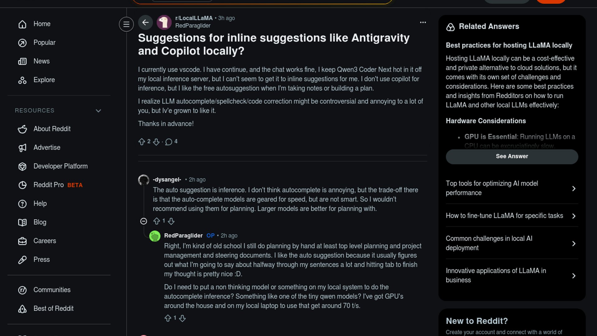 A Reddit user asks how to get local, Copilot-like inline completions in VS Code while already using Continue chat with Qwen3 Coder Next. Replies suggest that inline completion needs faster autocomplete-oriented models and point to setups using Continue with local backends plus coder-focused models like DeepSeek Coder or CodeQwen.
