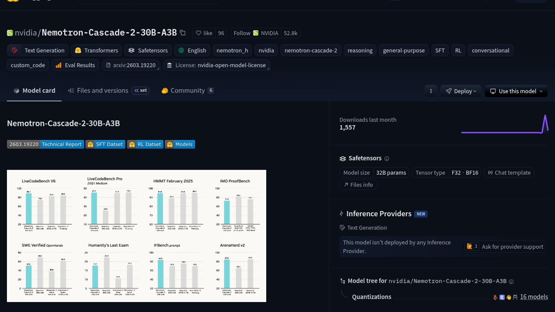 NVIDIA's Nemotron-Cascade-2-30B-A3B is an open 30B MoE model with 3B activated parameters, tuned for reasoning and agentic tasks. It ships with both thinking and instruct modes, plus checkpoints and a paper on Hugging Face.