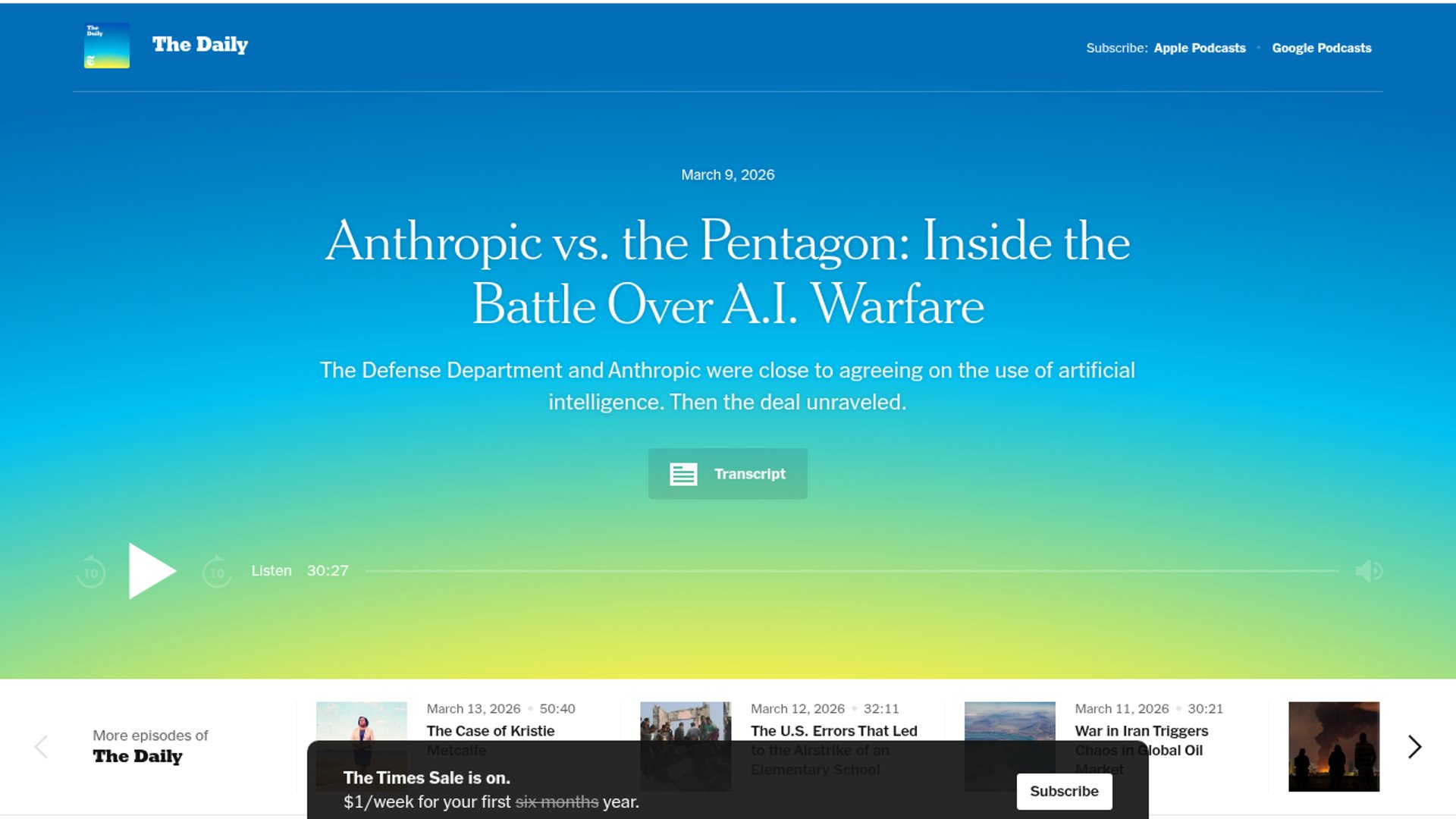 A New York Times Daily podcast episode examines the conflict between Anthropic's safety-focused restrictions on military AI use and the Pentagon's push to deploy AI in warfare applications. The episode surfaces how Anthropic's responsible scaling principles and acceptable use policies strain its relationship with defense department ambitions.