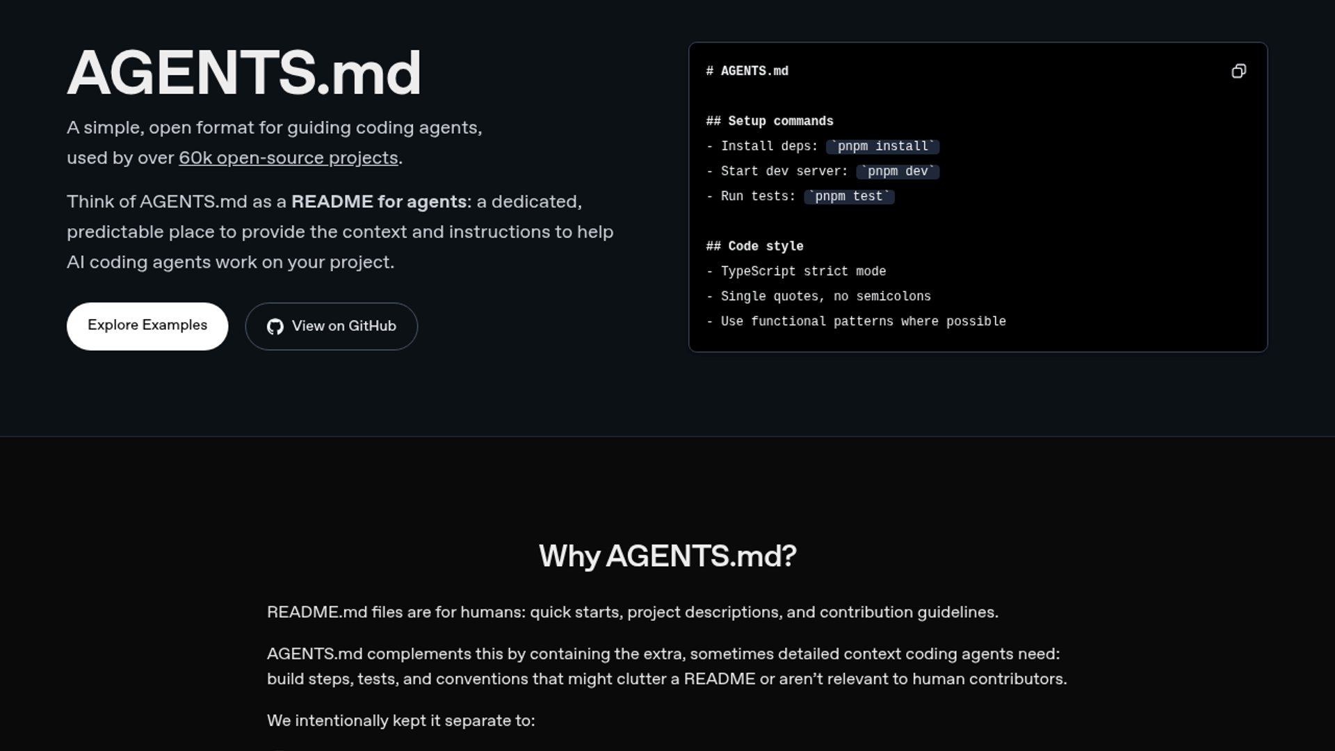 AGENTS.md is a lightweight, root-level markdown convention for telling AI coding agents how to work inside a repository. In this launch framing, it is effectively "Git for agents": instead of relying on ad hoc prompting, teams can keep project-specific instructions, conventions, and constraints alongside the code so agents have a stable source of truth.