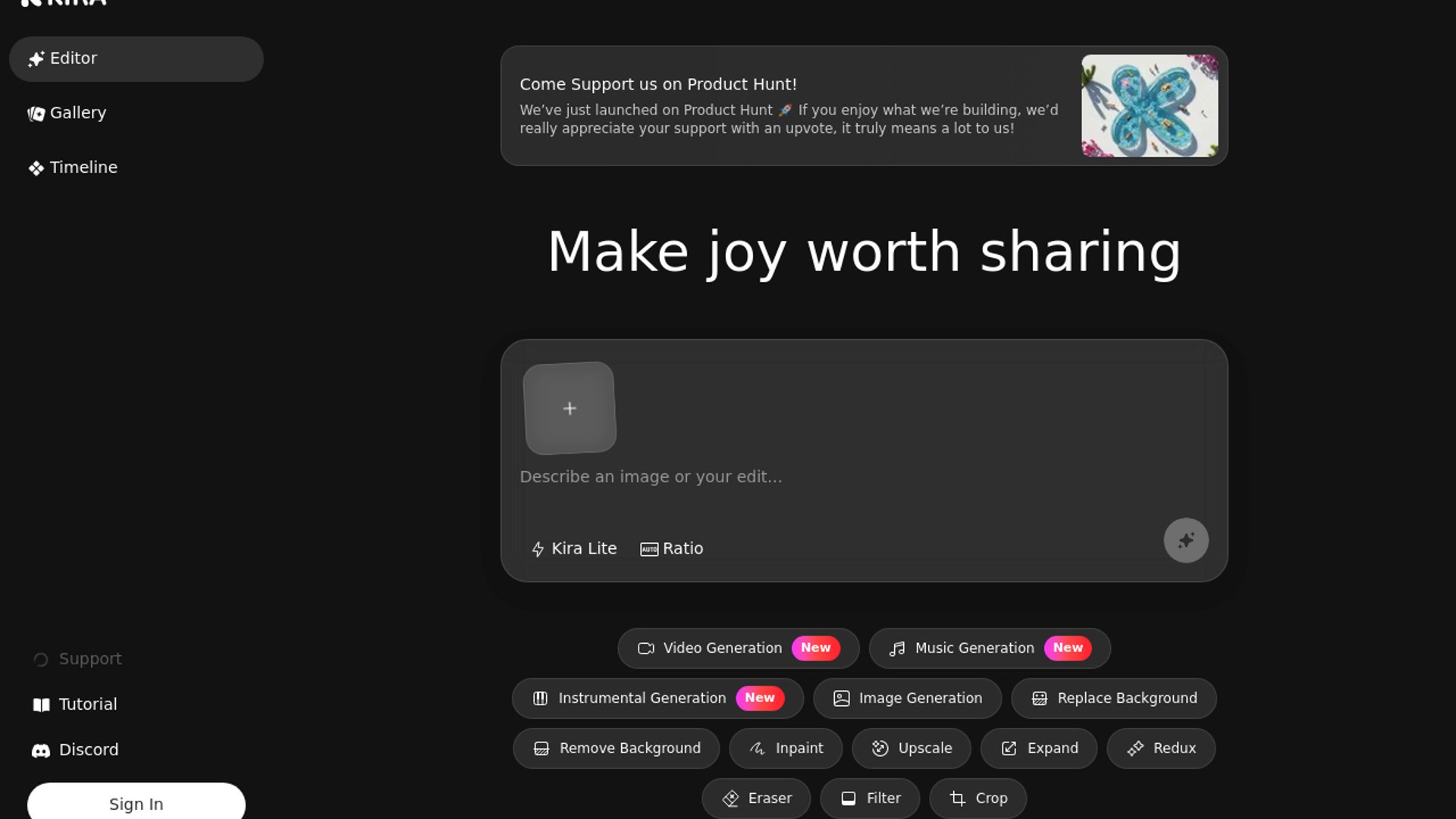 Kira 4.0 expands Kira’s browser-based image editor into a multimodal creation tool with music generation, instrumental mode, vocal layering, and auto-generated album covers, while also lowering video generation cost. The update positions Kira as a fast, no-skill social content playground rather than just an AI photo editor.