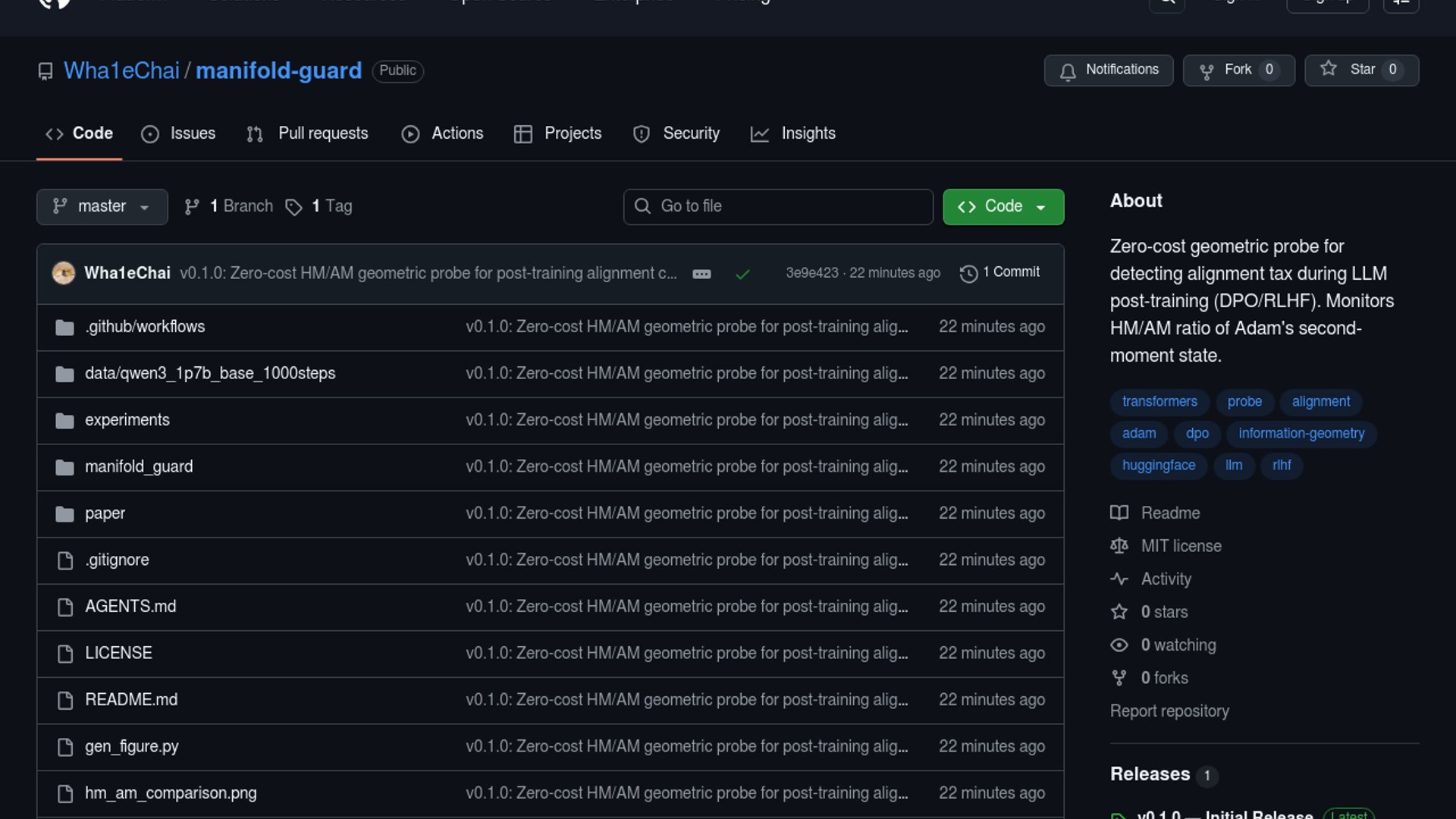 manifold-guard is a zero-cost probe that watches Adam’s second-moment HM/AM ratio during post-training. In the repo’s Qwen3-1.7B runs, DPO drives that ratio down by about 1,000x versus CLM and SFT even while loss stays flat near ln(2).