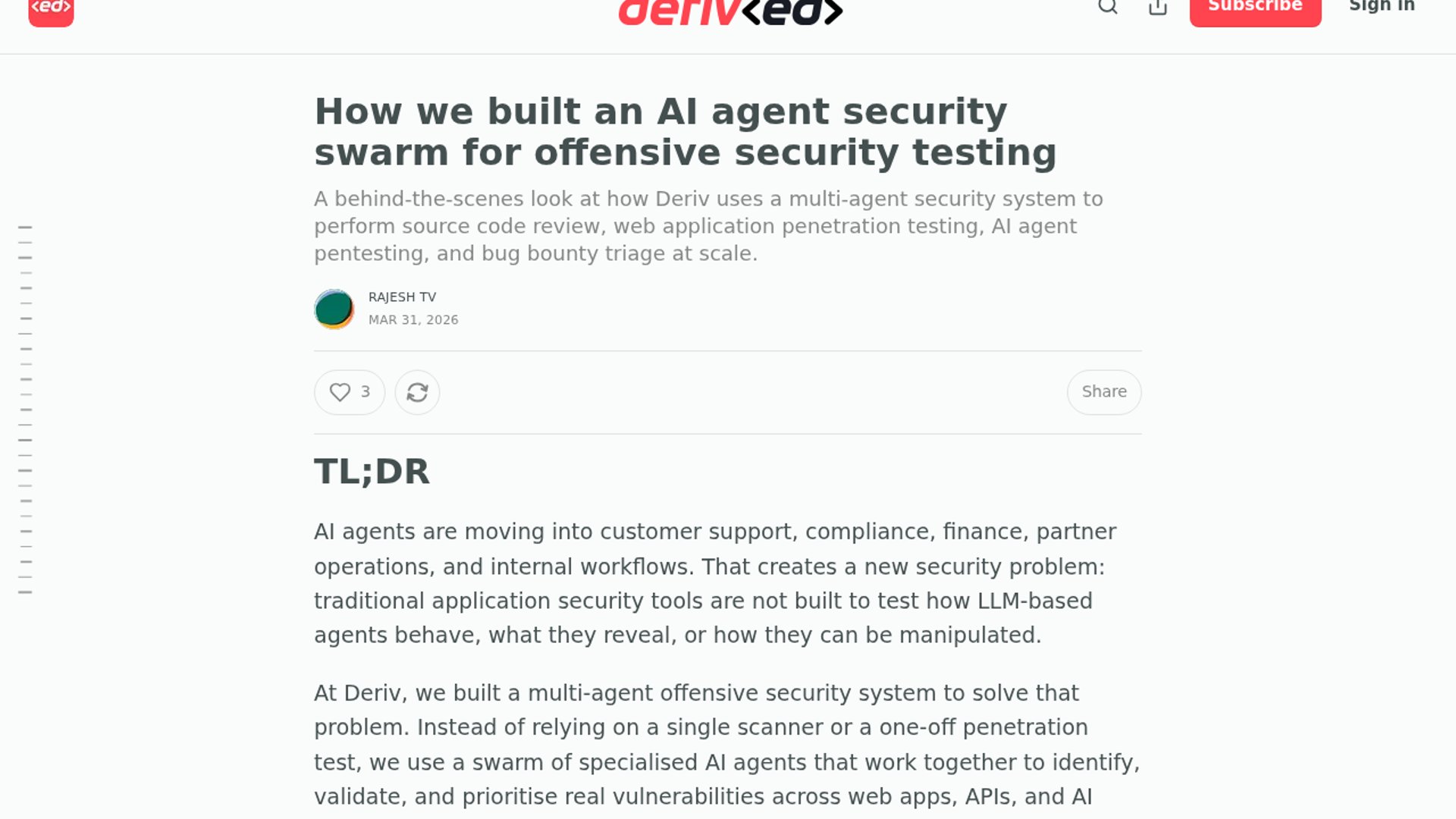 Deriv describes a multi-agent security system that handles source code review, web app pentesting, AI-agent pentesting, and bug bounty triage. In a grey-box test, the first phase finished in 18 minutes and surfaced six issues, including three critical findings.