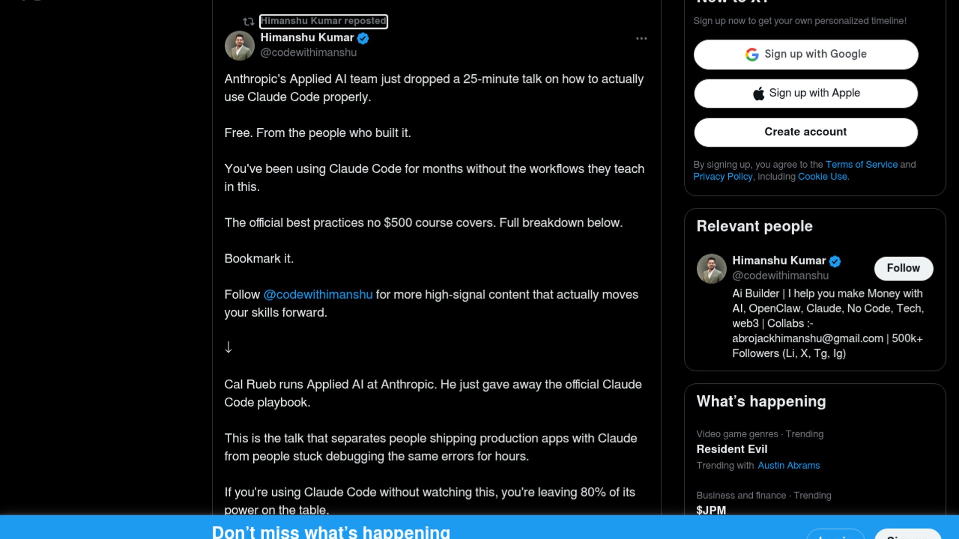 This post is a retweet pointing to a free Anthropic Applied AI talk that walks through how to use Claude Code properly in practice. It is not a new product launch so much as a hands-on tutorial for getting better results from an already-established coding assistant, likely aimed at developers who want clearer workflow habits, better prompting, and fewer false starts.