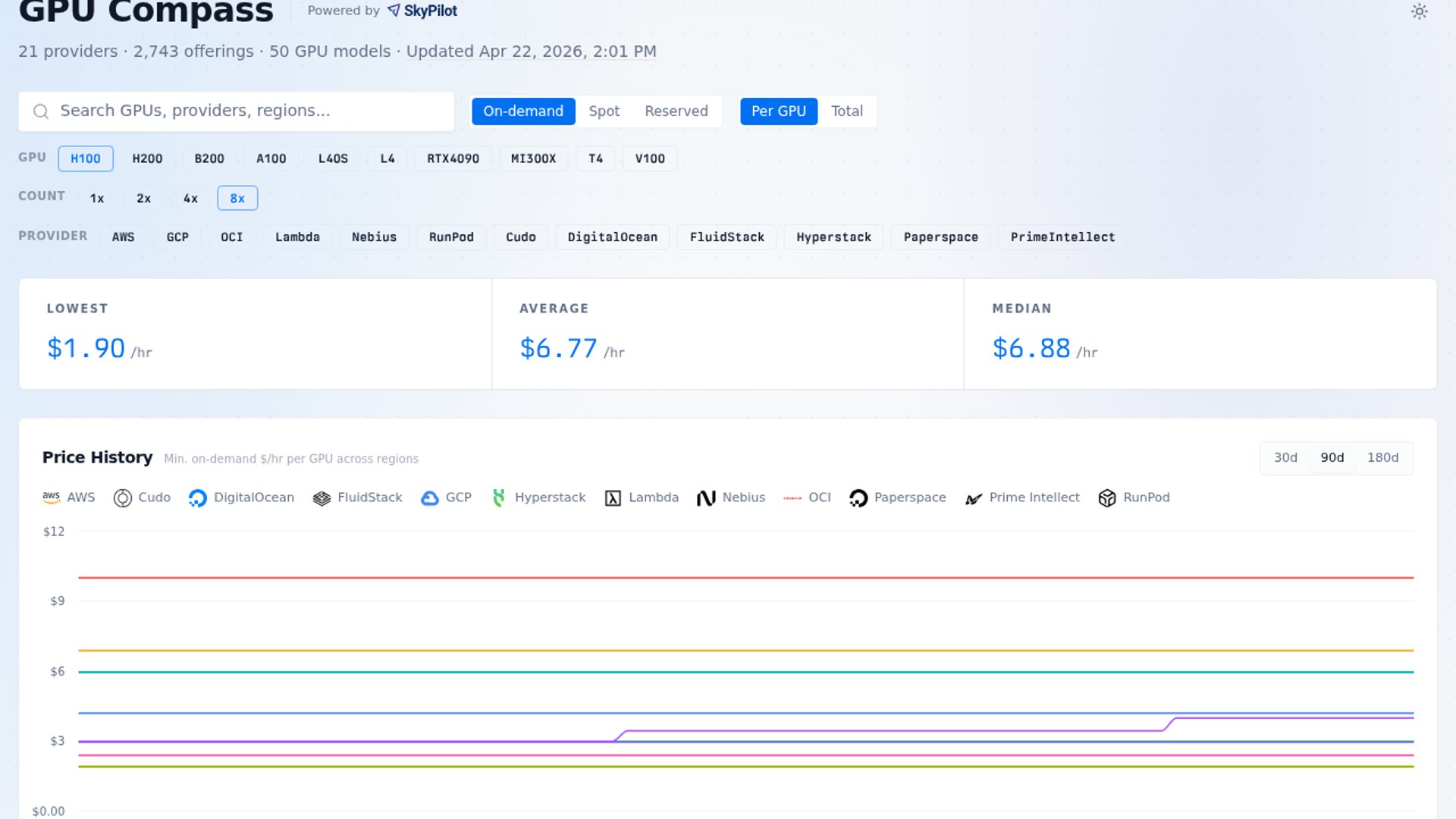 GPU Compass turns SkyPilot’s open-source GPU catalog into a browsable price tracker for 50 GPU models and 2,000+ cloud offerings. It pulls on-demand, spot, and historical spot data from 20+ cloud providers every seven hours.
