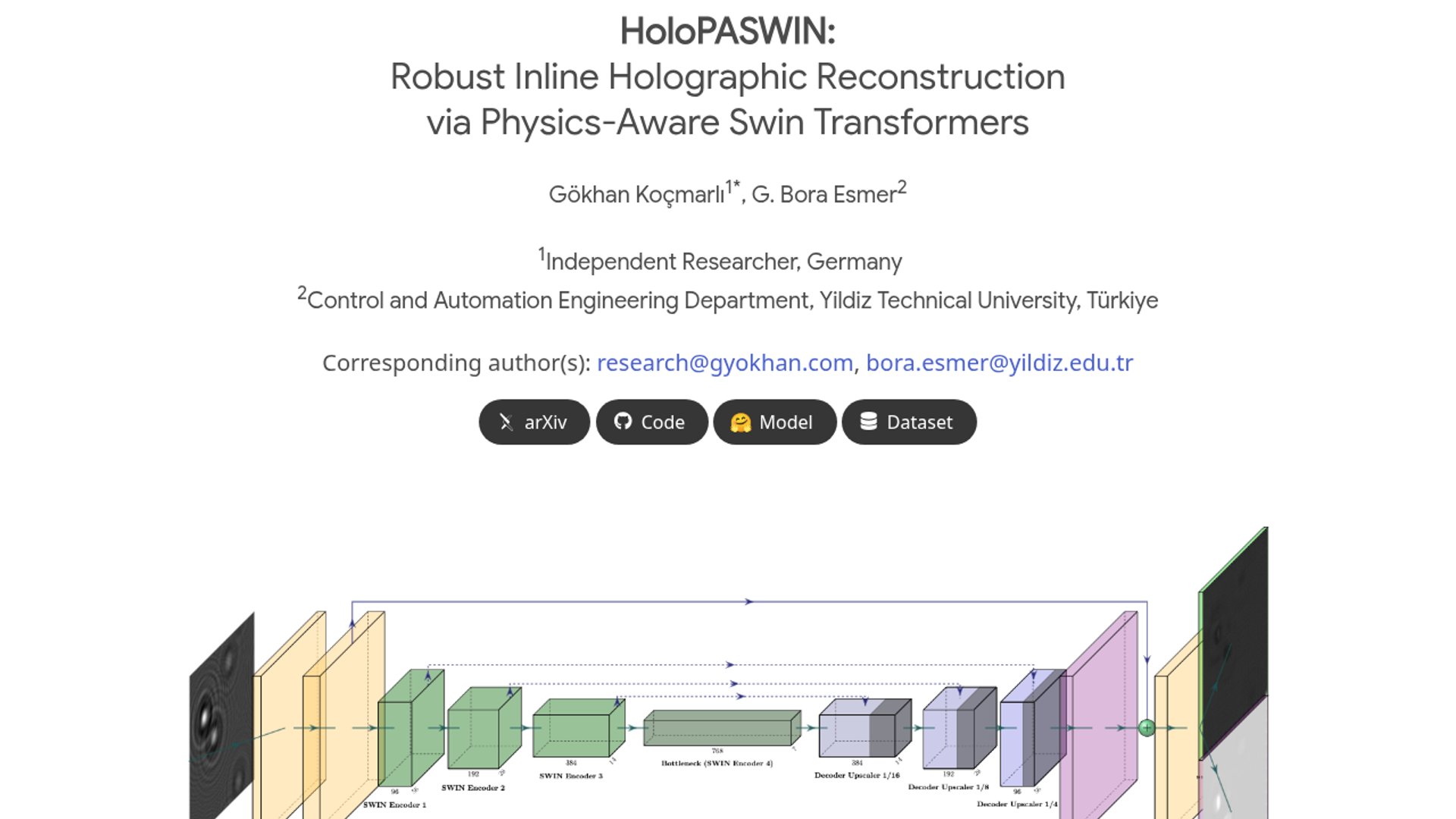 HoloPASWIN is a new research framework for inline digital holography that combines a Swin Transformer U-Net with a differentiable Angular Spectrum physics model to suppress twin-image artifacts. The authors report training on 25,000 noise-augmented samples and claim roughly a 15 dB PSNR gain over standard ASM baselines, with code and paper now public.