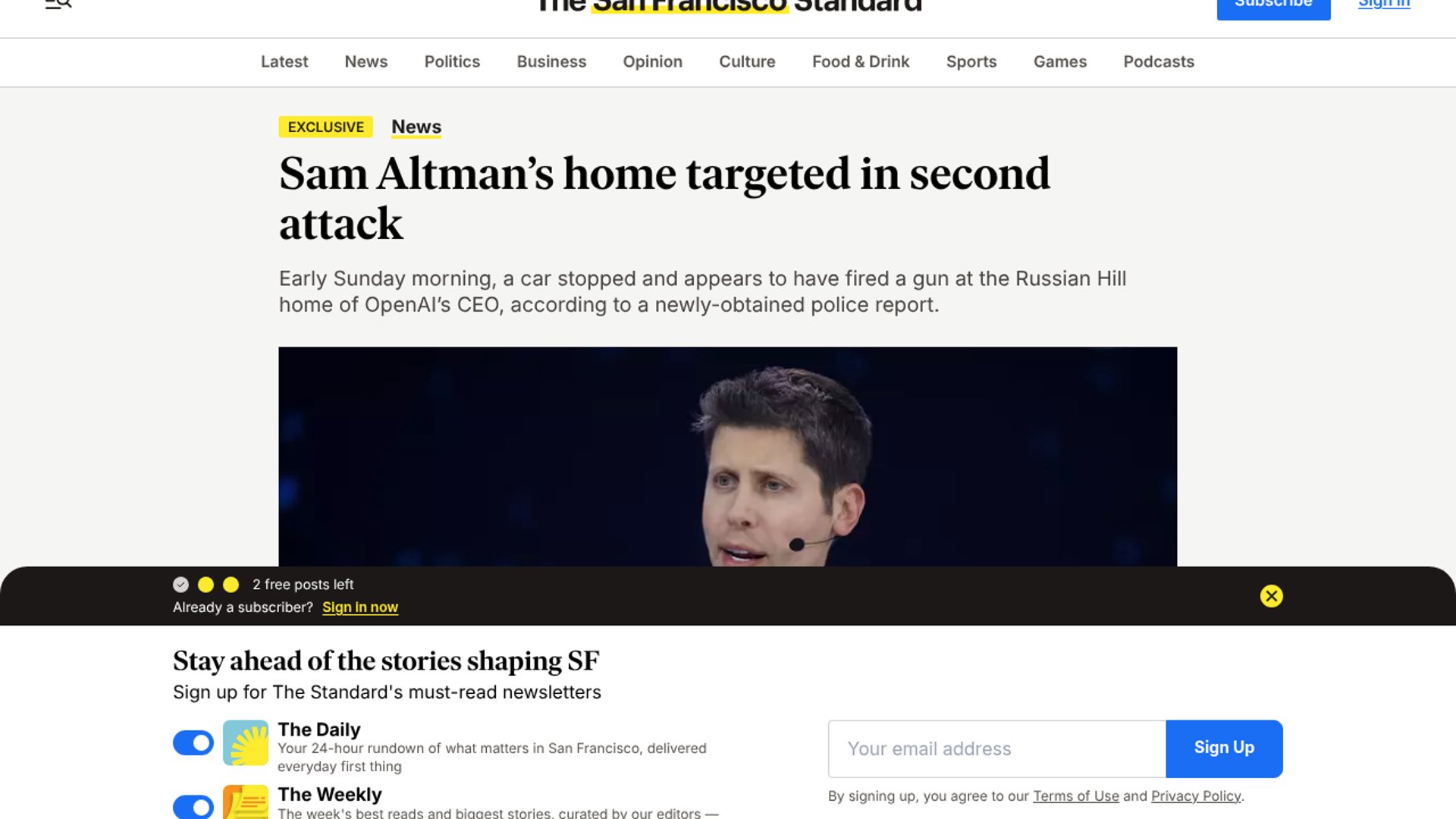 OpenAI CEO Sam Altman’s San Francisco residence was targeted in a drive-by shooting early Sunday, the second violent incident at the property in 48 hours. Following a separate Molotov cocktail attack and threats to OpenAI’s headquarters, police arrested two suspects and seized three firearms. The escalation has prompted heightened security across the company's facilities as public debate over AGI risks increasingly manifests as physical violence.