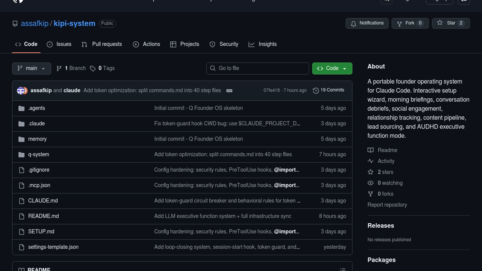 Kipi System is an open-source “externalized brain” for Claude Code that turns a founder’s day into a friction-ordered action plan, auto-drafts follow-ups in the user’s voice, tracks open loops, and routes conversation notes into canonical memory files. The repo frames the project as scaffolding for both humans and AI: the human side reduces decision fatigue with prewritten actions and escalation timers, while the AI side uses verification gates, step reloading, and no-skip rules to keep the agent from skipping required work. The pitch leans on long-context research such as “Lost in the Middle,” and positions the system as a reusable workflow brain for founders, sales, legal, and consulting work.