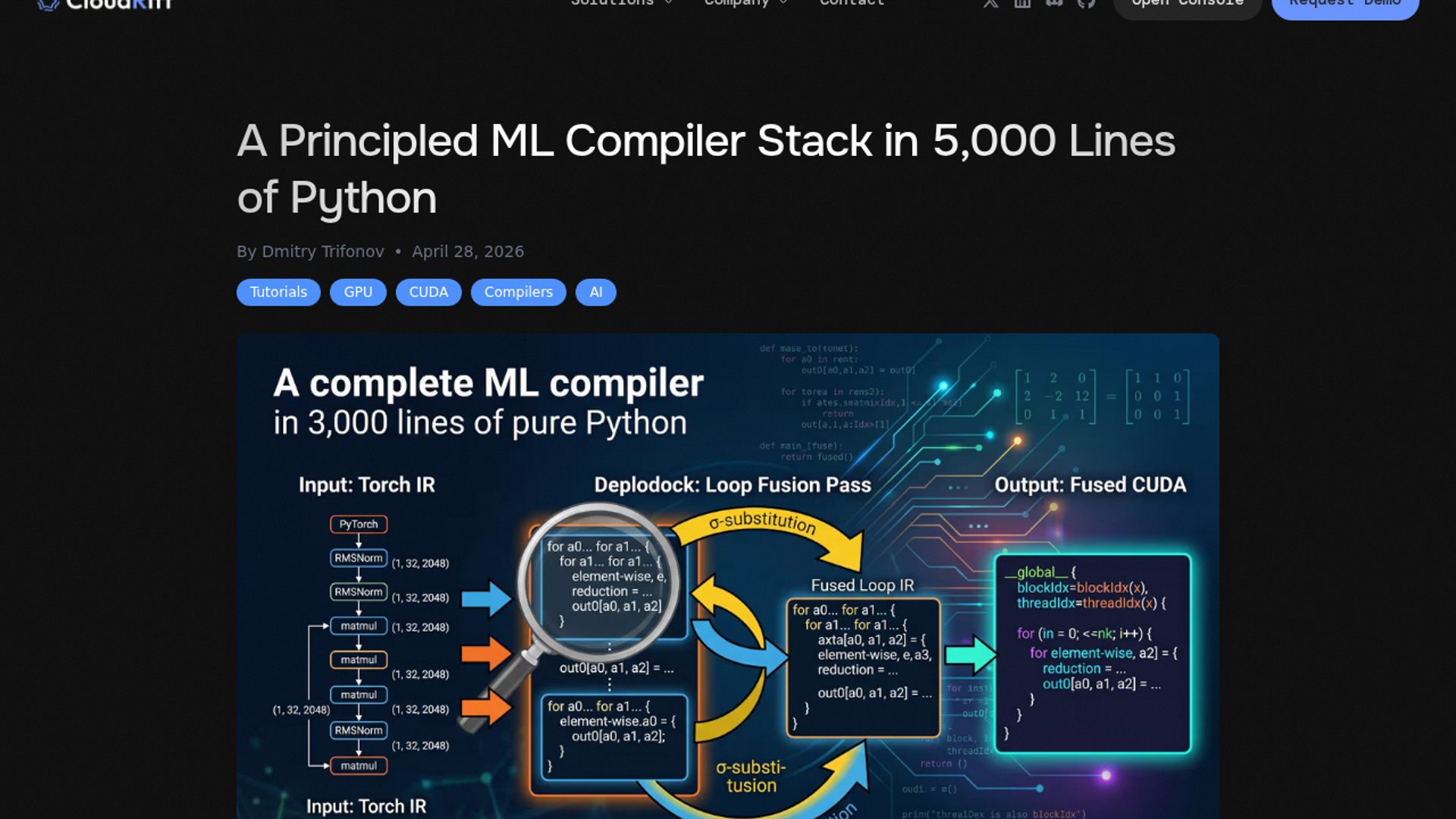 CloudRift’s Deplodock is a pure-Python, raw-CUDA LLM compiler stack that lowers PyTorch graphs through six IRs into emitted kernels. The article walks through RMSNorm and argues the stack can hit roughly 50-90% of the production path on selected workloads while staying small enough to inspect and hack.