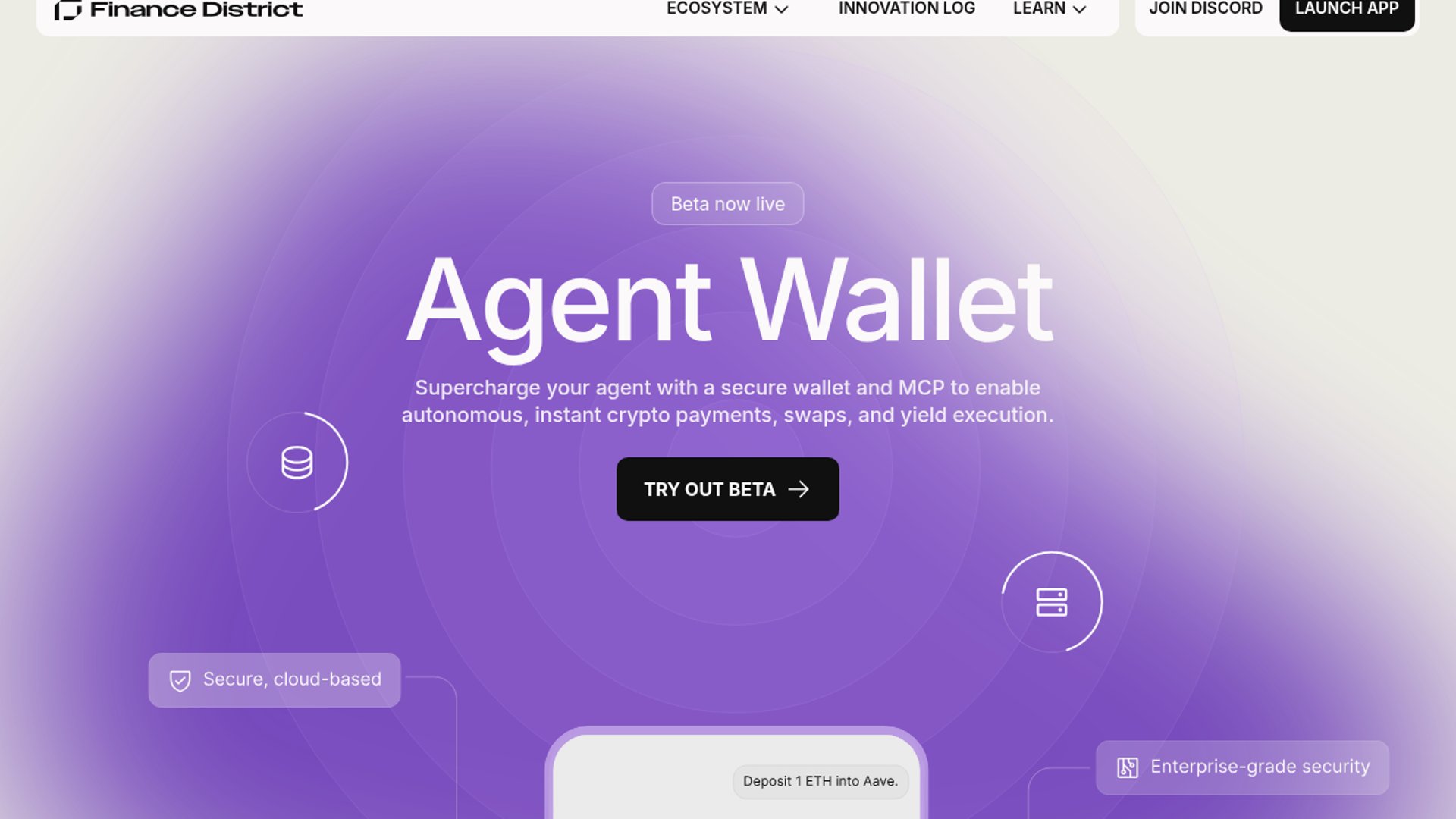 Finance District’s Agent Wallet is a beta, MCP-native wallet for AI agents. It lets agents hold funds, send payments, swap tokens, and pursue yield through MCP, CLI, or a conversational assistant.