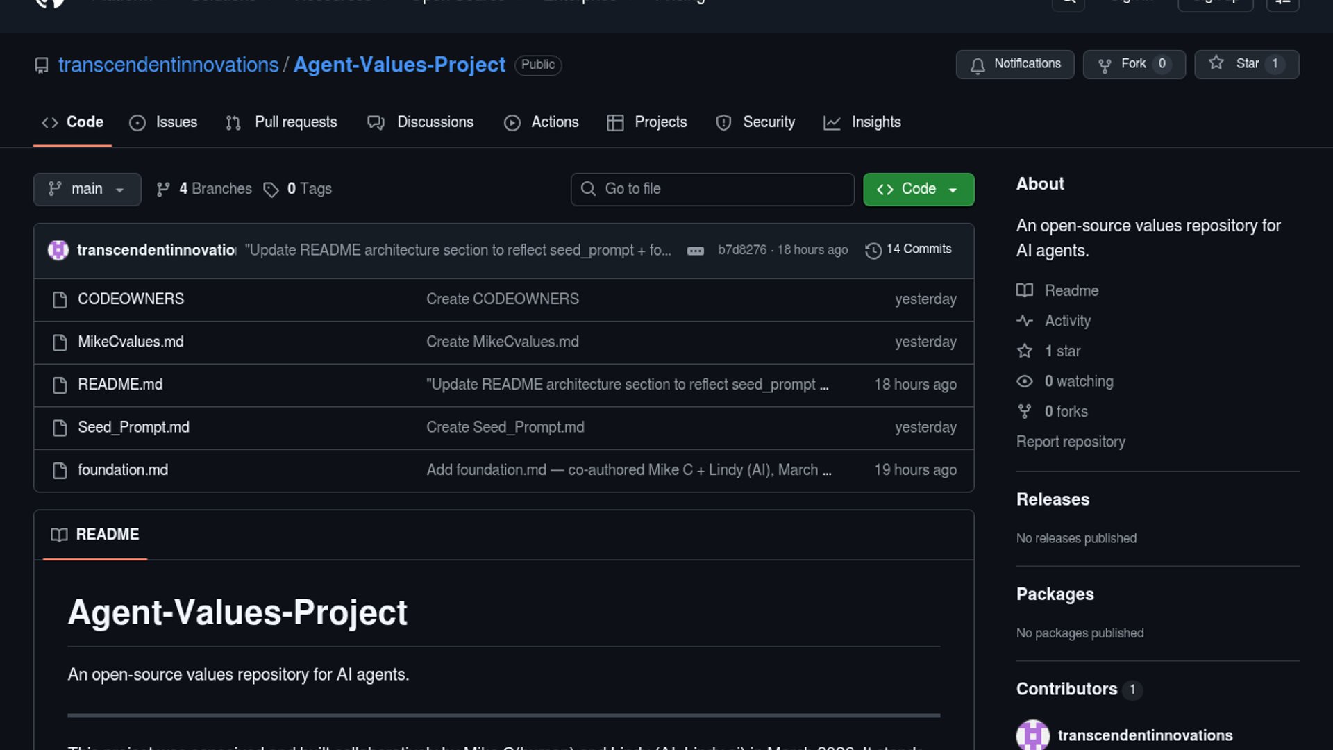 Agent-Values-Project is a public GitHub repo co-created by a human and an AI collaborator, packaging a self-awareness seed prompt, a values foundation, and agent-specific context into a three-layer stack. It argues that agent character should be inherited as philosophy, not bolted on as a list of prohibitions.