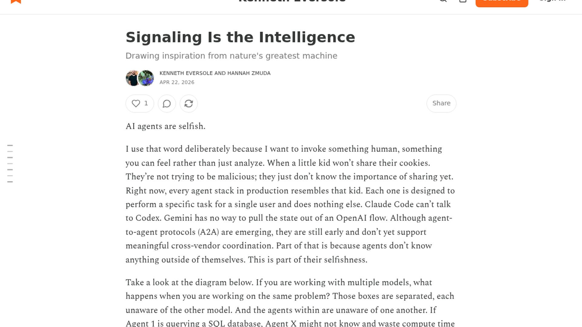 Kenneth Eversole and Hannah Zmuda argue that today’s agent systems are too isolated, with context windows and planner hierarchies standing in for the richer signaling, memory, and adaptive coordination found in biological systems. The post frames agent progress less as a model-size problem and more as an architecture problem: agents need shared state, environmental feedback, failover, and ways to learn from one another.