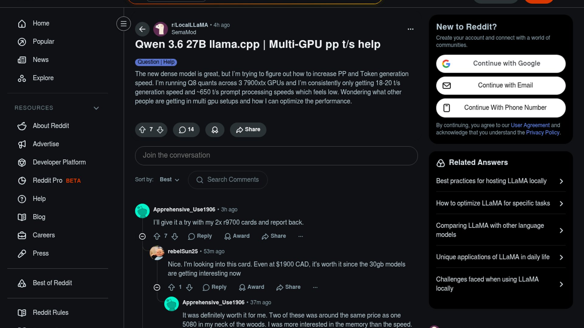 A Reddit user reports 18-20 t/s generation and about 650 t/s prompt processing on Q8 quants across three Radeon 7900 XTX GPUs in llama.cpp. The post asks whether those numbers are normal and what tuning tricks actually move the needle in multi-GPU AMD setups.