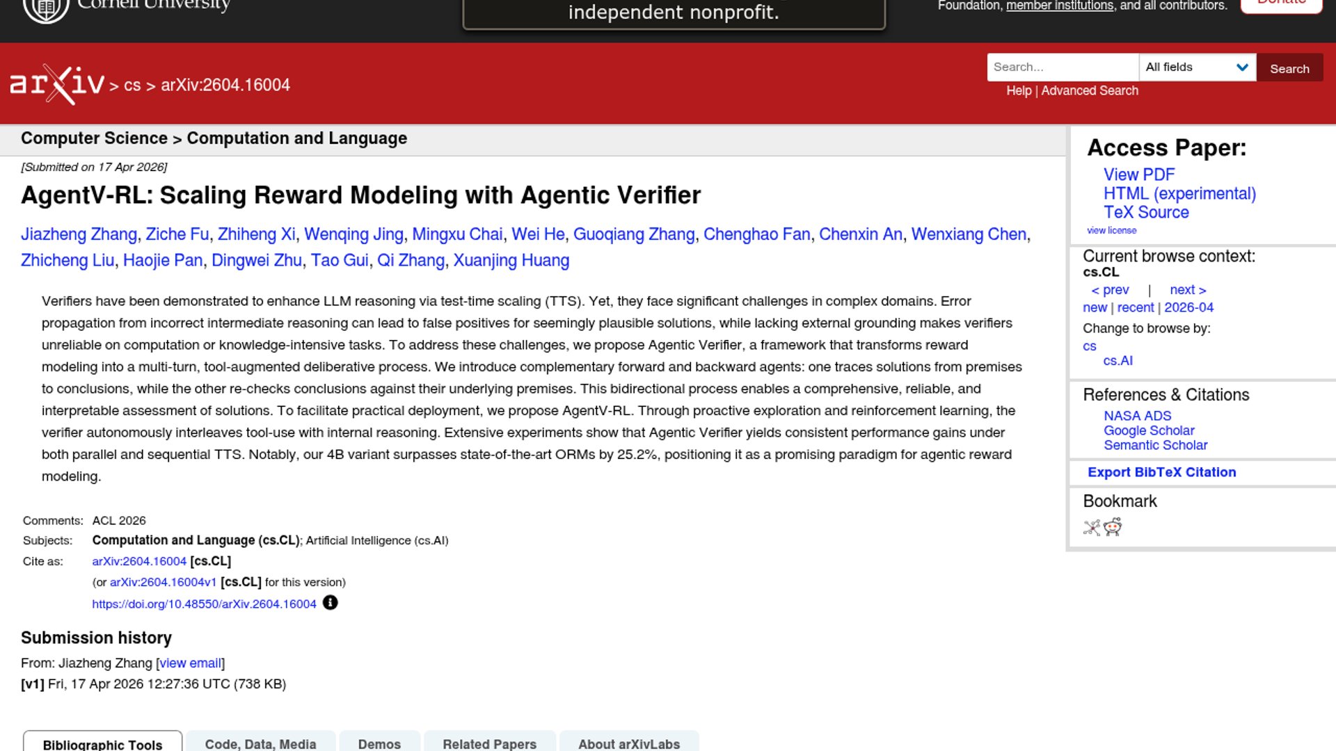 AgentV-RL is an ACL 2026 research framework for agentic reward modeling, using forward and backward verifier agents to judge LLM reasoning traces through multi-turn, tool-augmented checks. The paper reports consistent gains for test-time scaling, including a 4B verifier beating state-of-the-art outcome reward models by 25.2%.