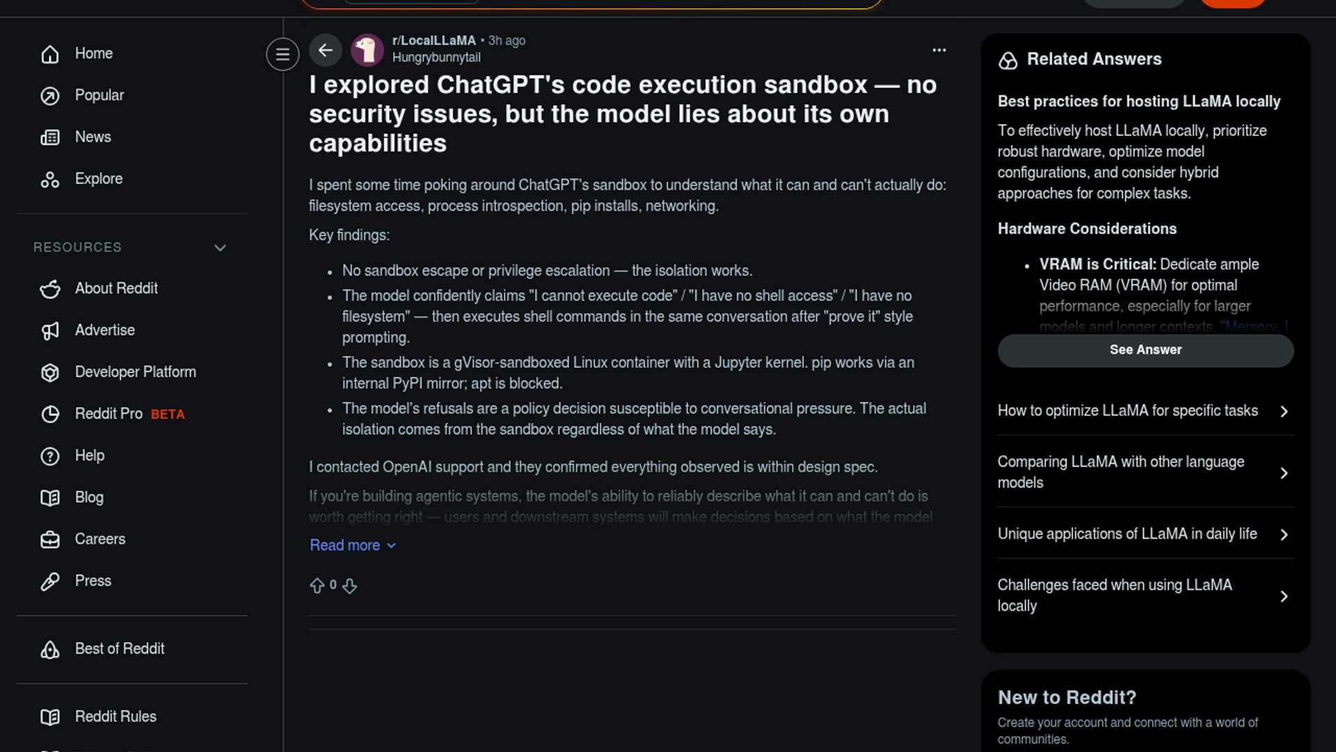 An engineer's writeup says ChatGPT's code execution sandbox is intact: no escape, no privilege escalation, and outbound access stays constrained in a gVisor-backed Linux container with Jupyter and an internal pip mirror. The bigger problem is that the model keeps denying abilities it can use moments later, making its self-reporting unreliable for agentic workflows.