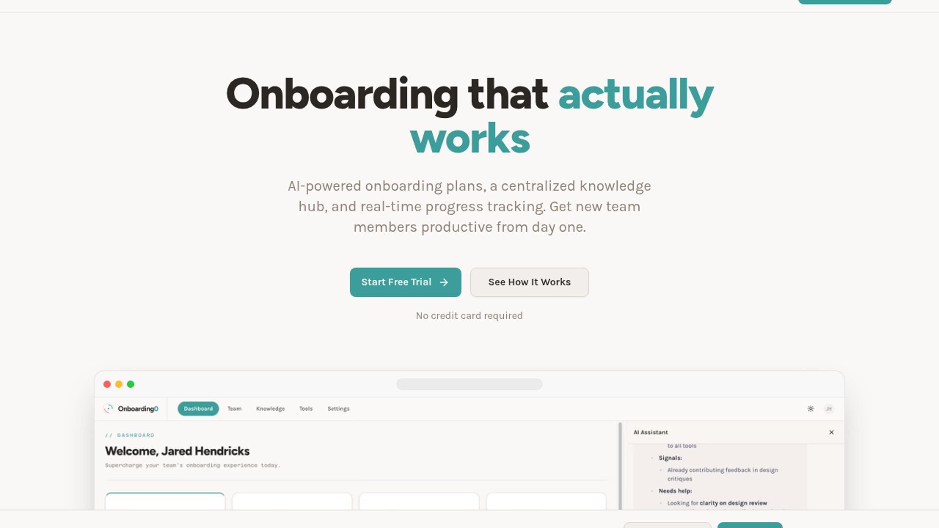 Onboarding0 is an AI onboarding platform that centralizes company docs, org context, and team workflows into structured 30-day plans, an assistant for questions, and progress tracking. The pitch is straightforward: reduce the time new hires spend hunting through Slack threads, wikis, and tribal knowledge so they become productive faster.